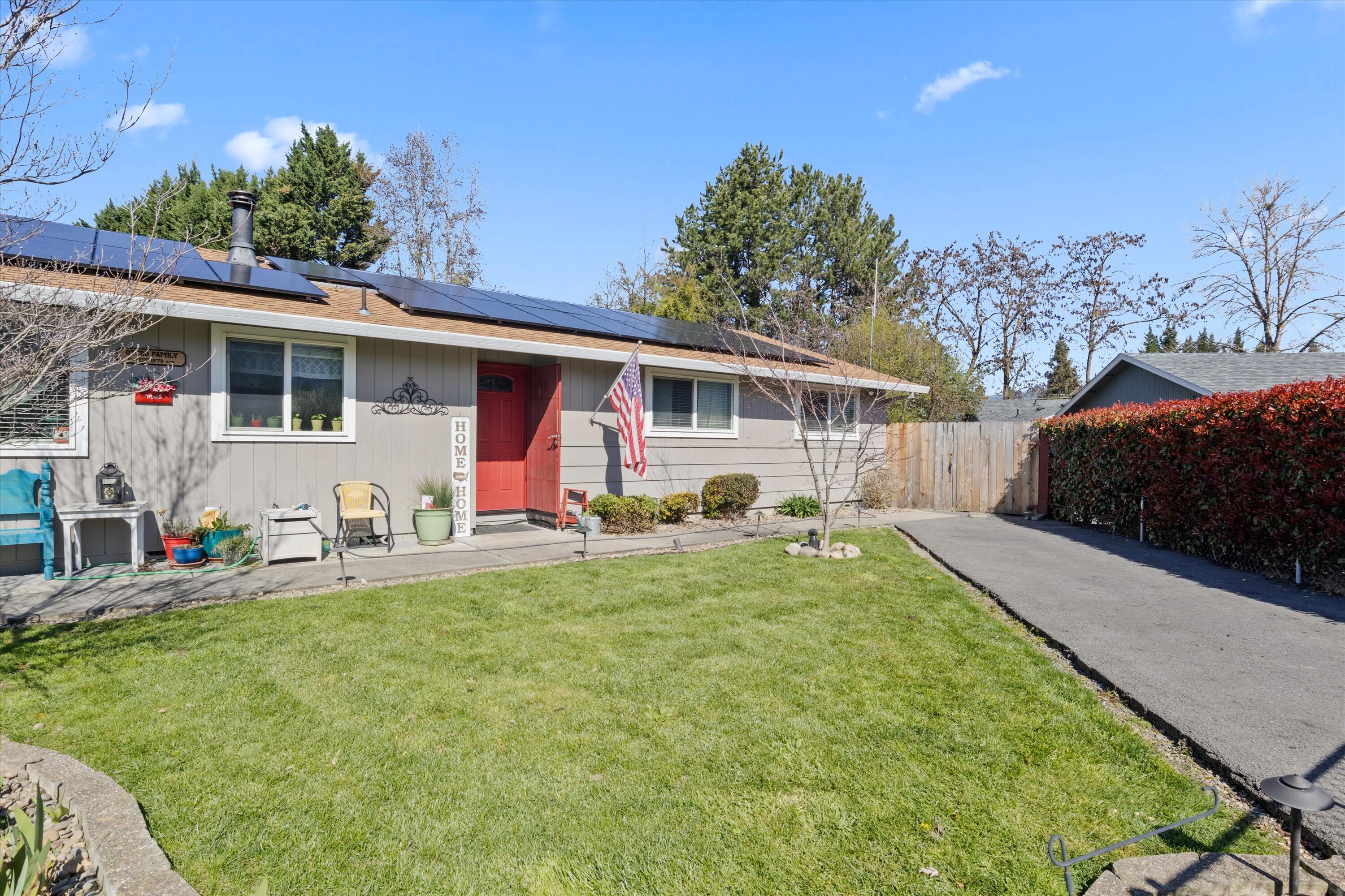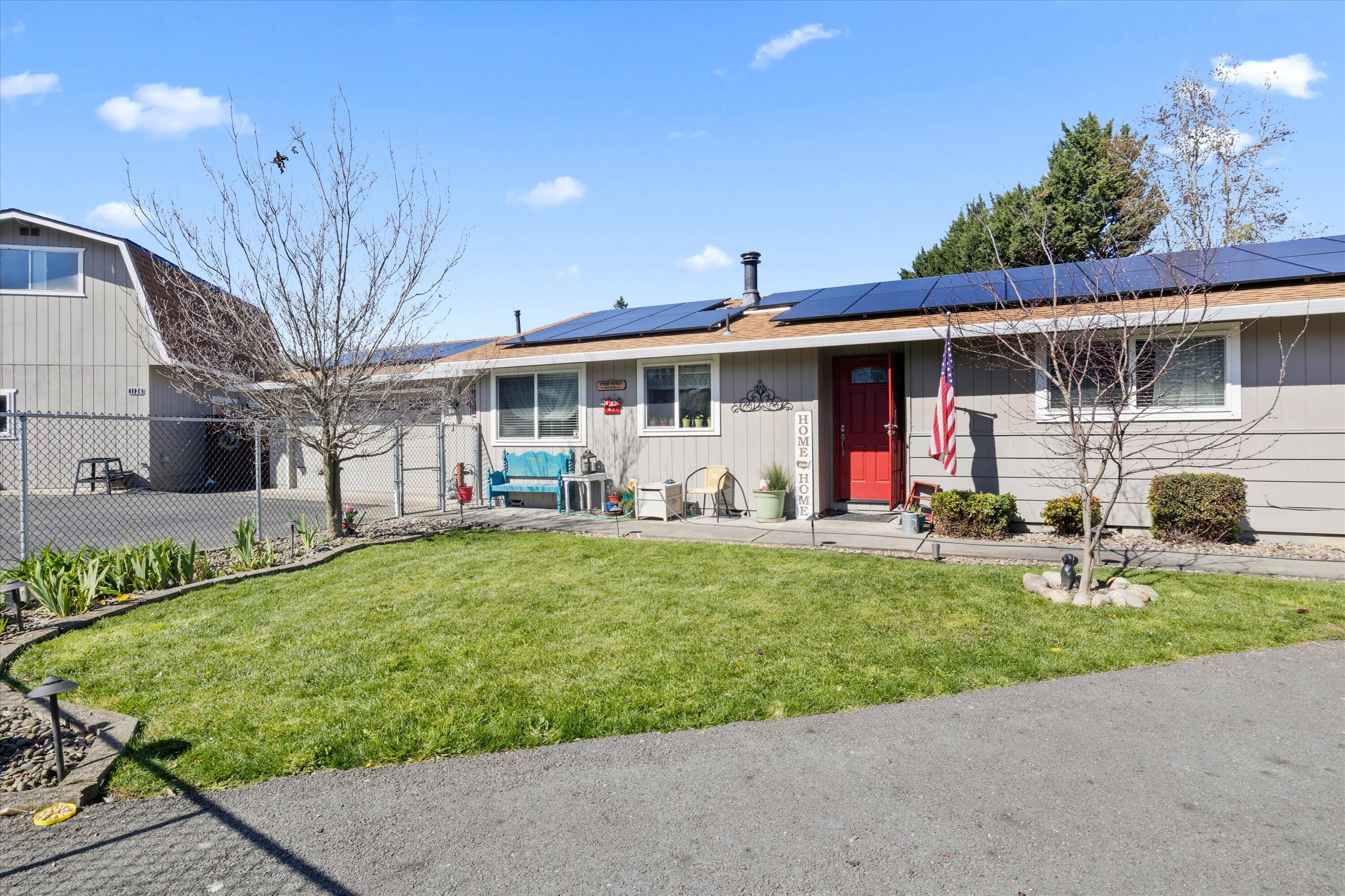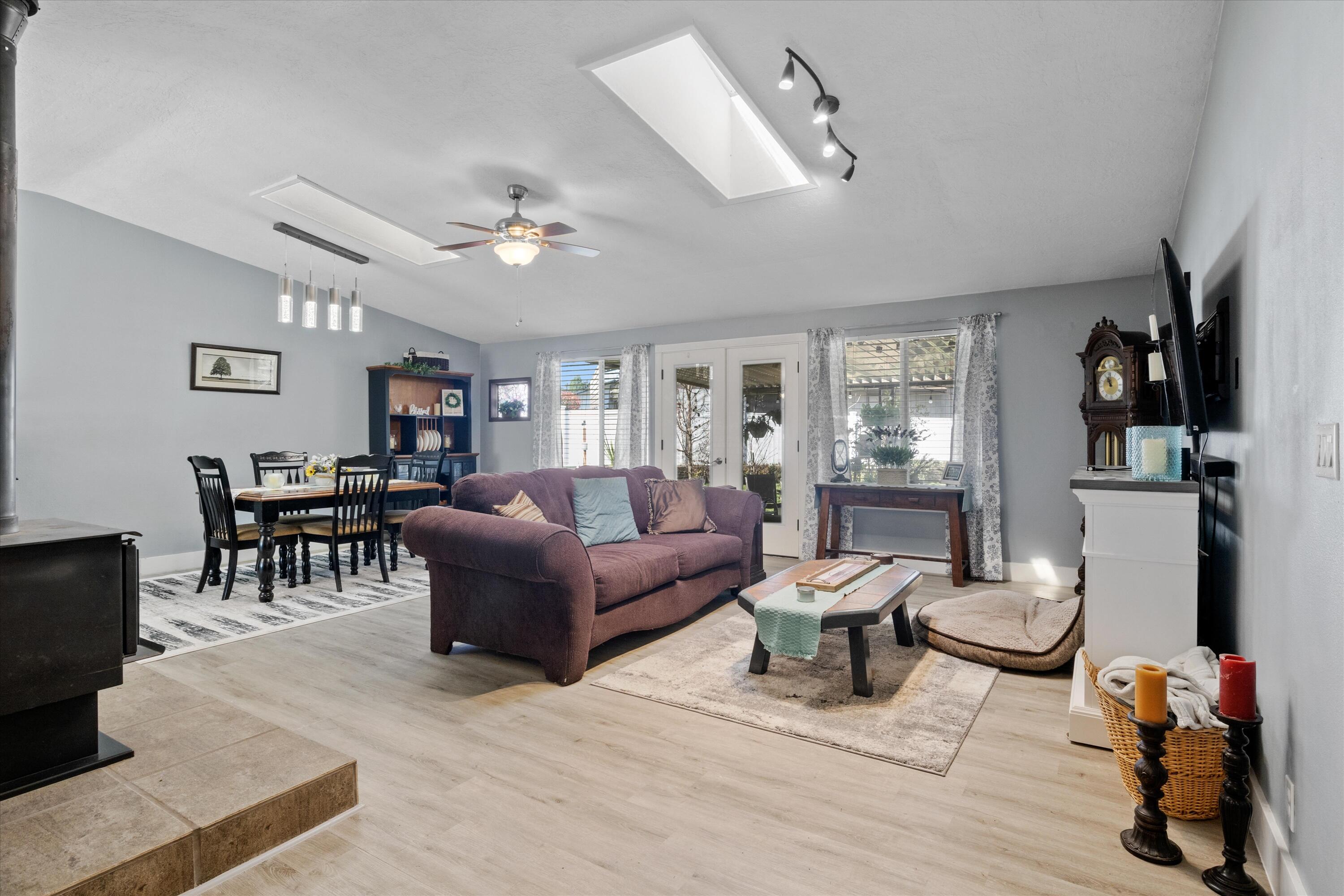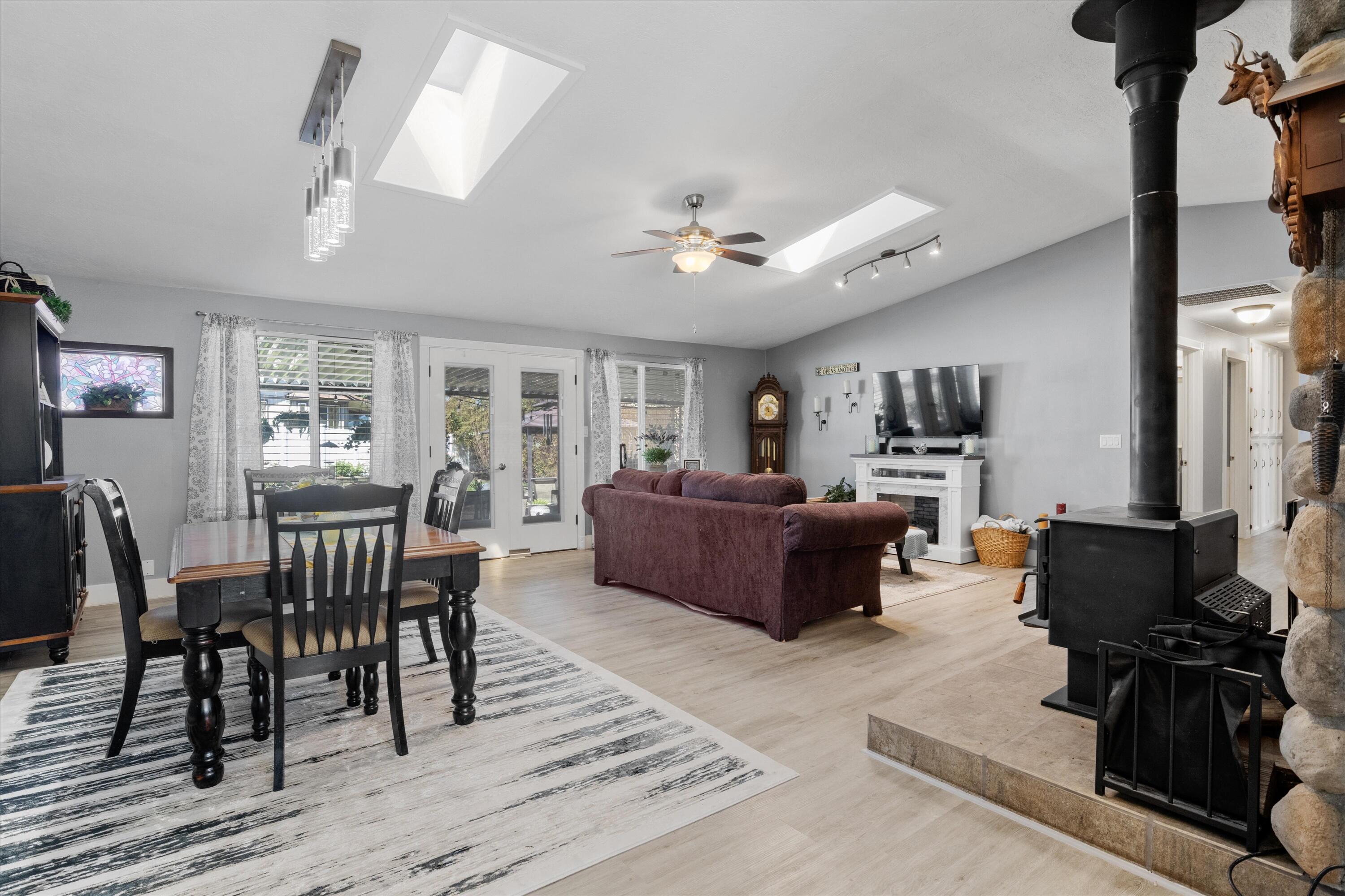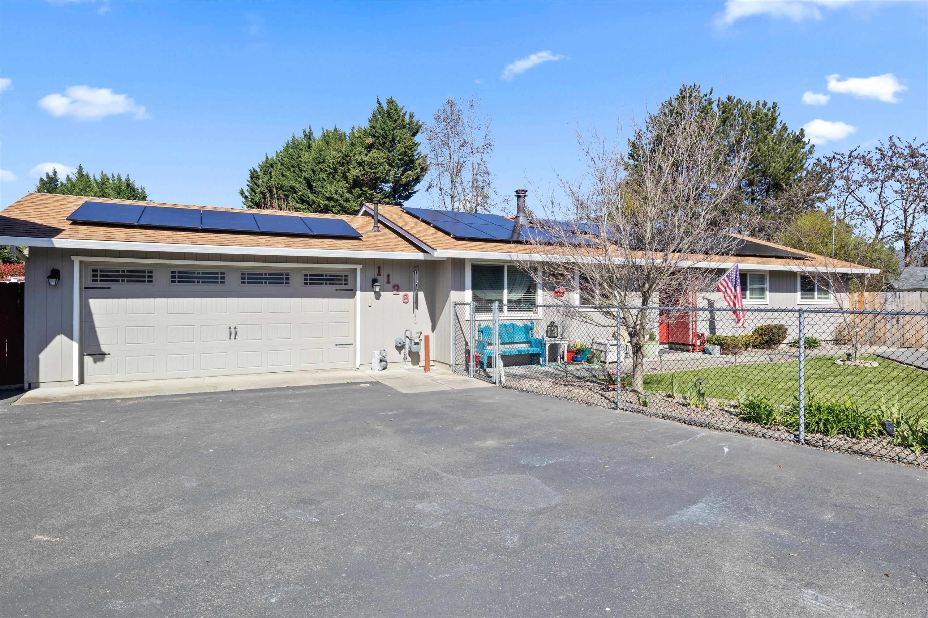 Tremendously Captivating Home with a new roof and Solar Panels, full RV hook-ups, and Detached ADU! Marvelously situated on a 0.35-acre cul-de-sac lot in an established community, this 3BR/2BA property warmly welcomes with a classic exterior color scheme, brilliant red front door, and a neatly manicured fenced-in front yard. Filled with soft natural light, the interior delights with luminous skylights, an open floorplan, vaulted ceilings, beautiful faux wood flooring, and a living room with a wood burning stove. Upgraded to perfection, the kitchen features stainless steel appliances, two-tone cabinets, gas stove, and a dining area. Intended for relaxation, the primary bedroom includes an attached en suite with a dual sink vanity. Multigenerational appeal is found in the detached ADU, which has a 3/4-bathroom and a full kitchen. Other features: 2-car garage with workshop/ storage. The newly fenced-in back yard features paver patio under a gazebo, numerous fruit trees, and chicken coop!