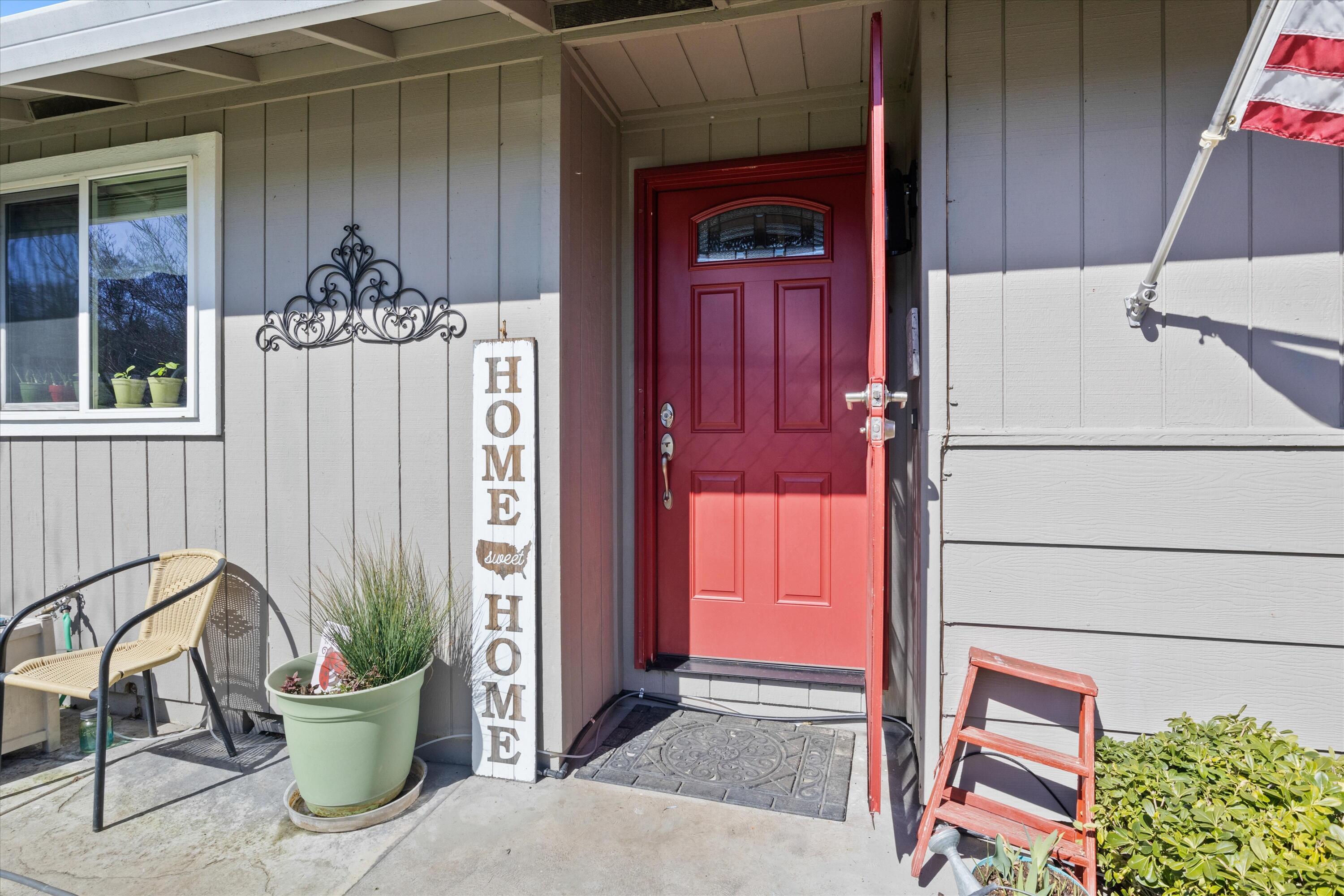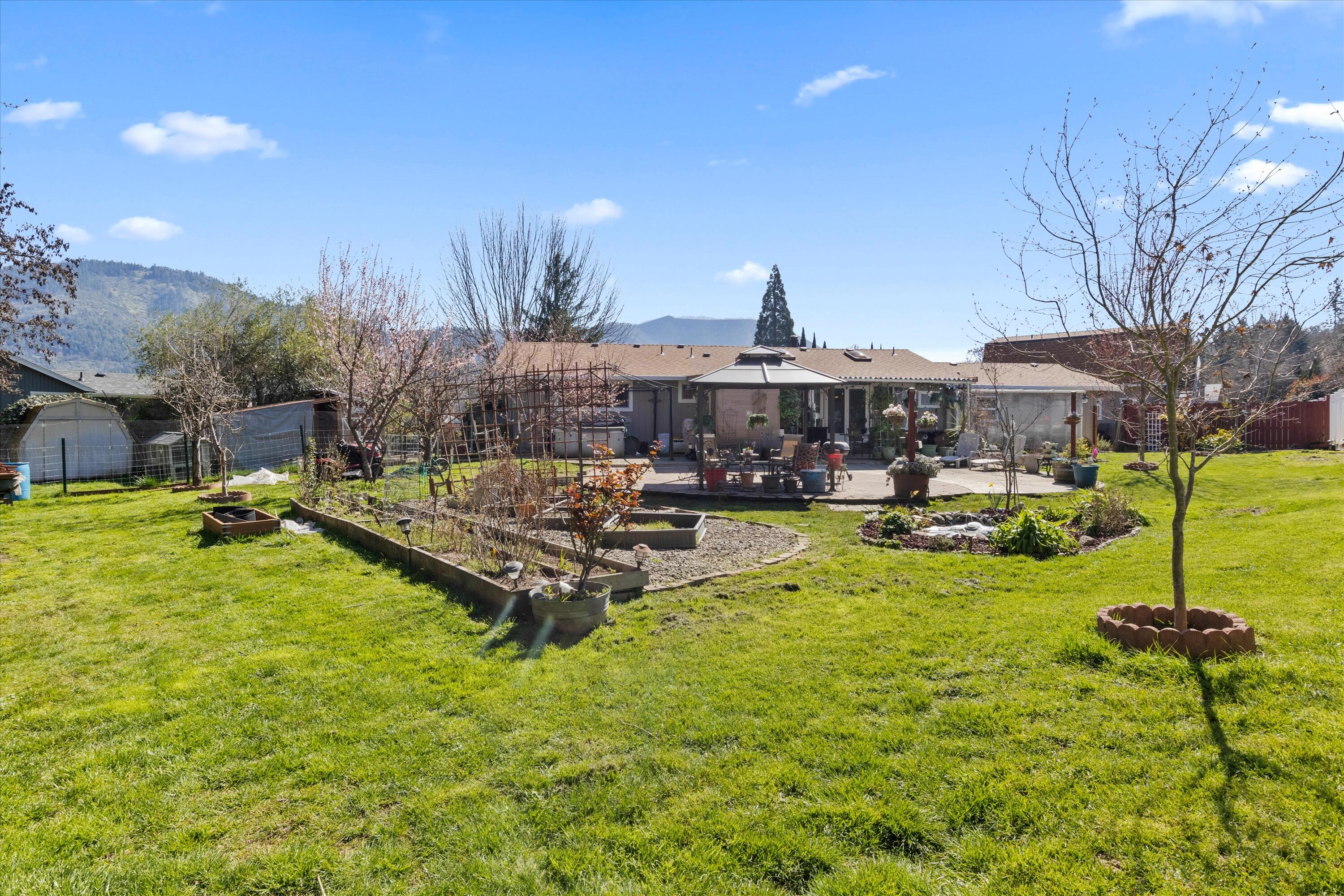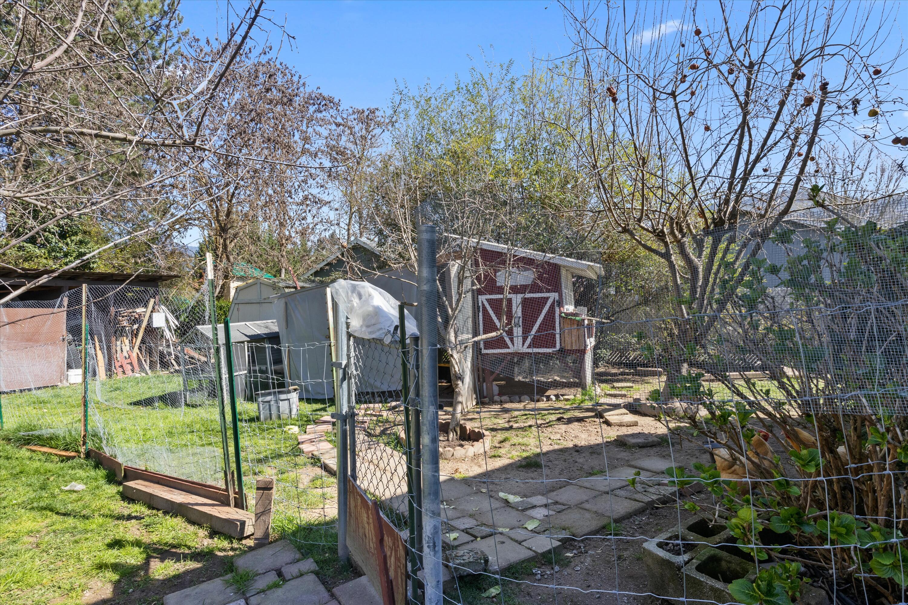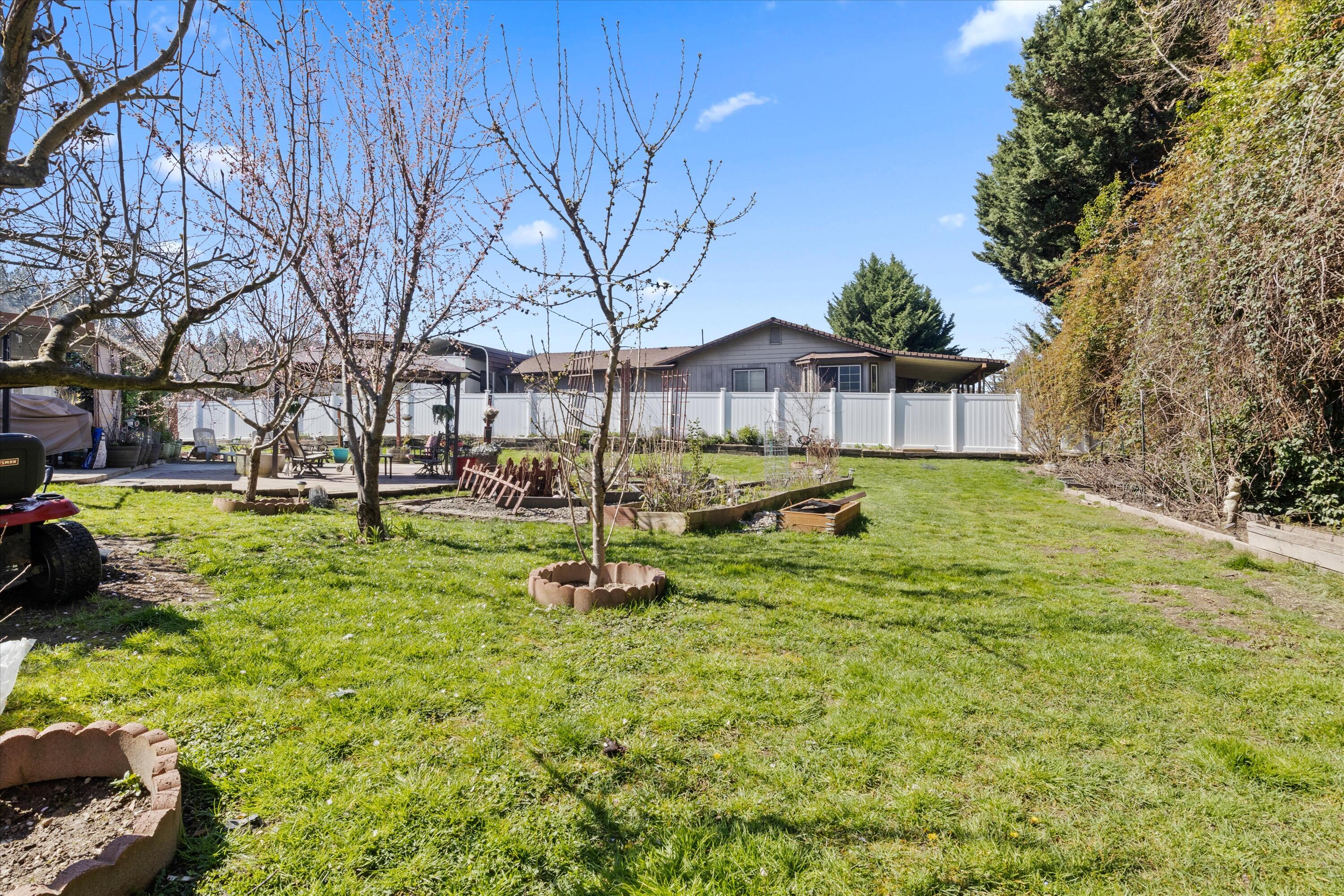 Tremendously Captivating Home with a new roof and Solar Panels, full RV hook-ups, and Detached ADU! Marvelously situated on a 0.35-acre cul-de-sac lot in an established community, this 3BR/2BA property warmly welcomes with a classic exterior color scheme, brilliant red front door, and a neatly manicured fenced-in front yard. Filled with soft natural light, the interior delights with luminous skylights, an open floorplan, vaulted ceilings, beautiful faux wood flooring, and a living room with a wood burning stove. Upgraded to perfection, the kitchen features stainless steel appliances, two-tone cabinets, gas stove, and a dining area. Intended for relaxation, the primary bedroom includes an attached en suite with a dual sink vanity. Multigenerational appeal is found in the detached ADU, which has a 3/4-bathroom and a full kitchen. Other features: 2-car garage with workshop/ storage. The newly fenced-in back yard features paver patio under a gazebo, numerous fruit trees, and chicken coop!