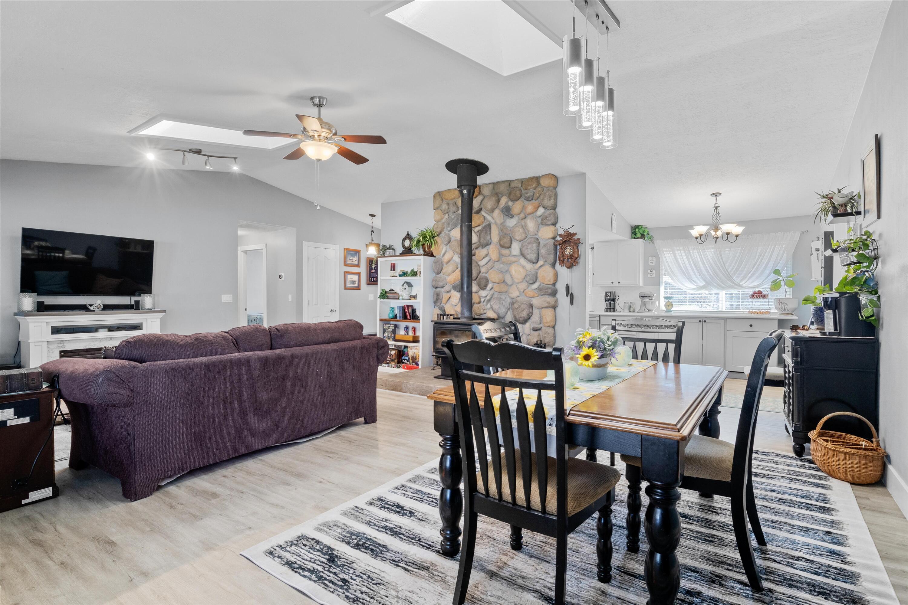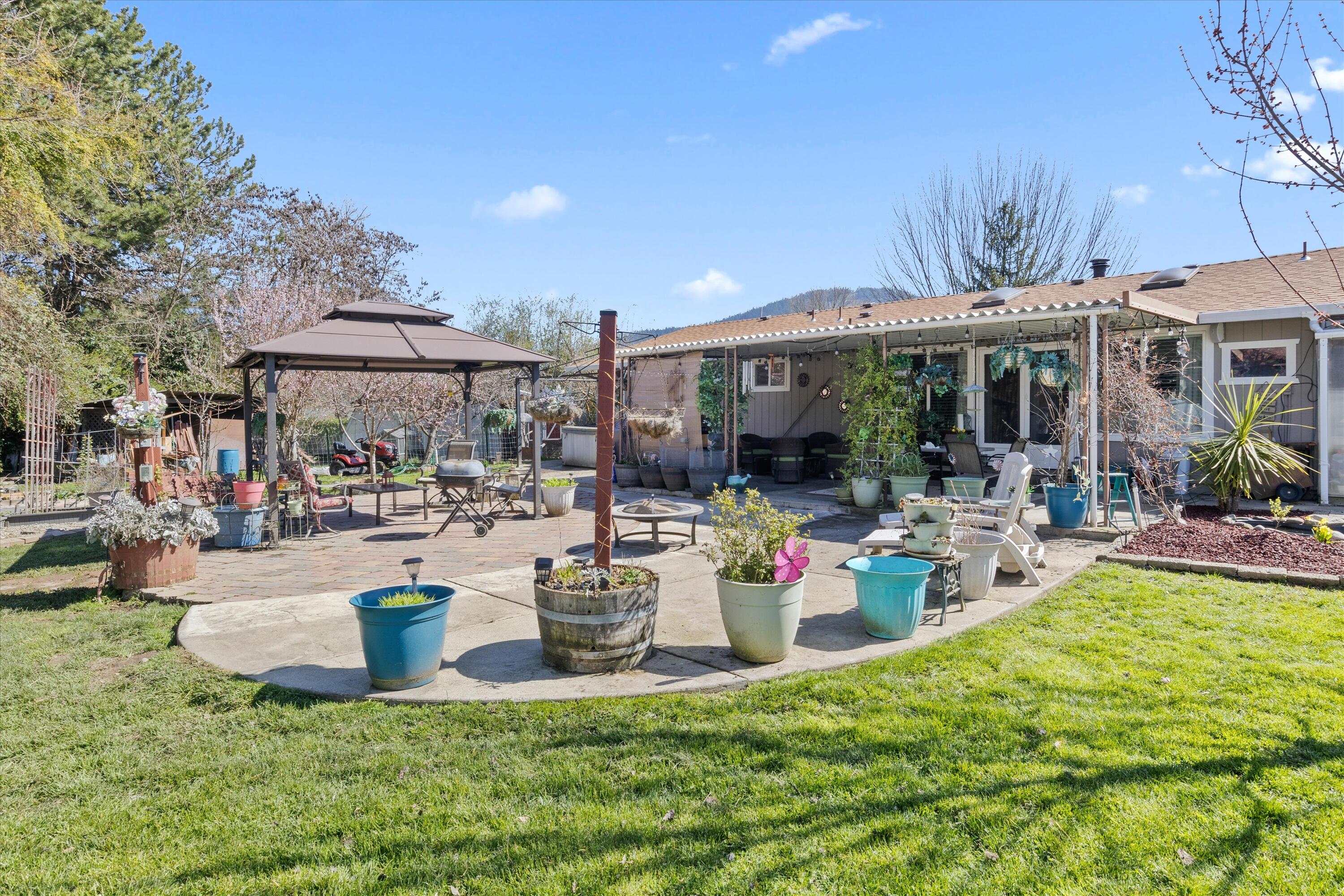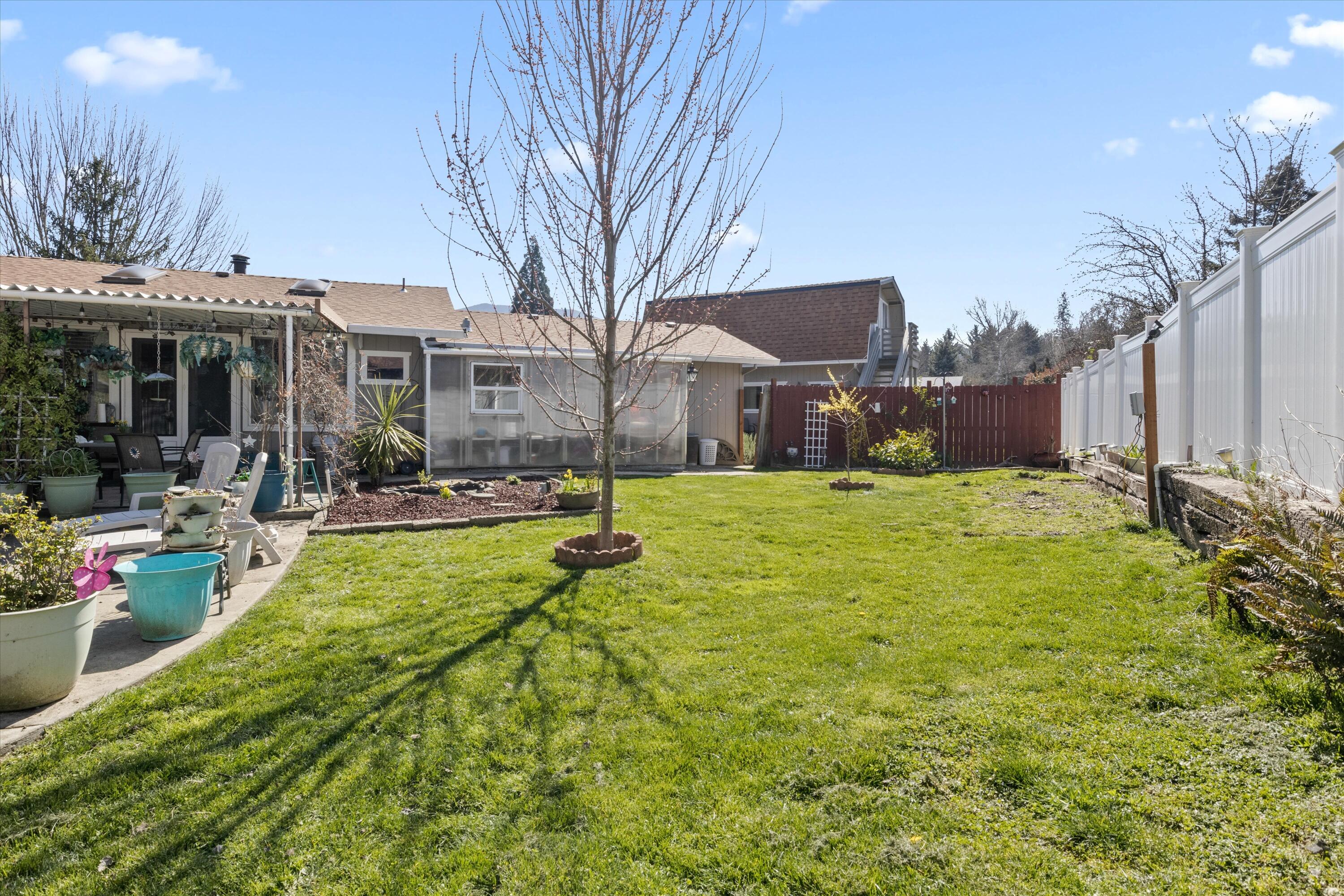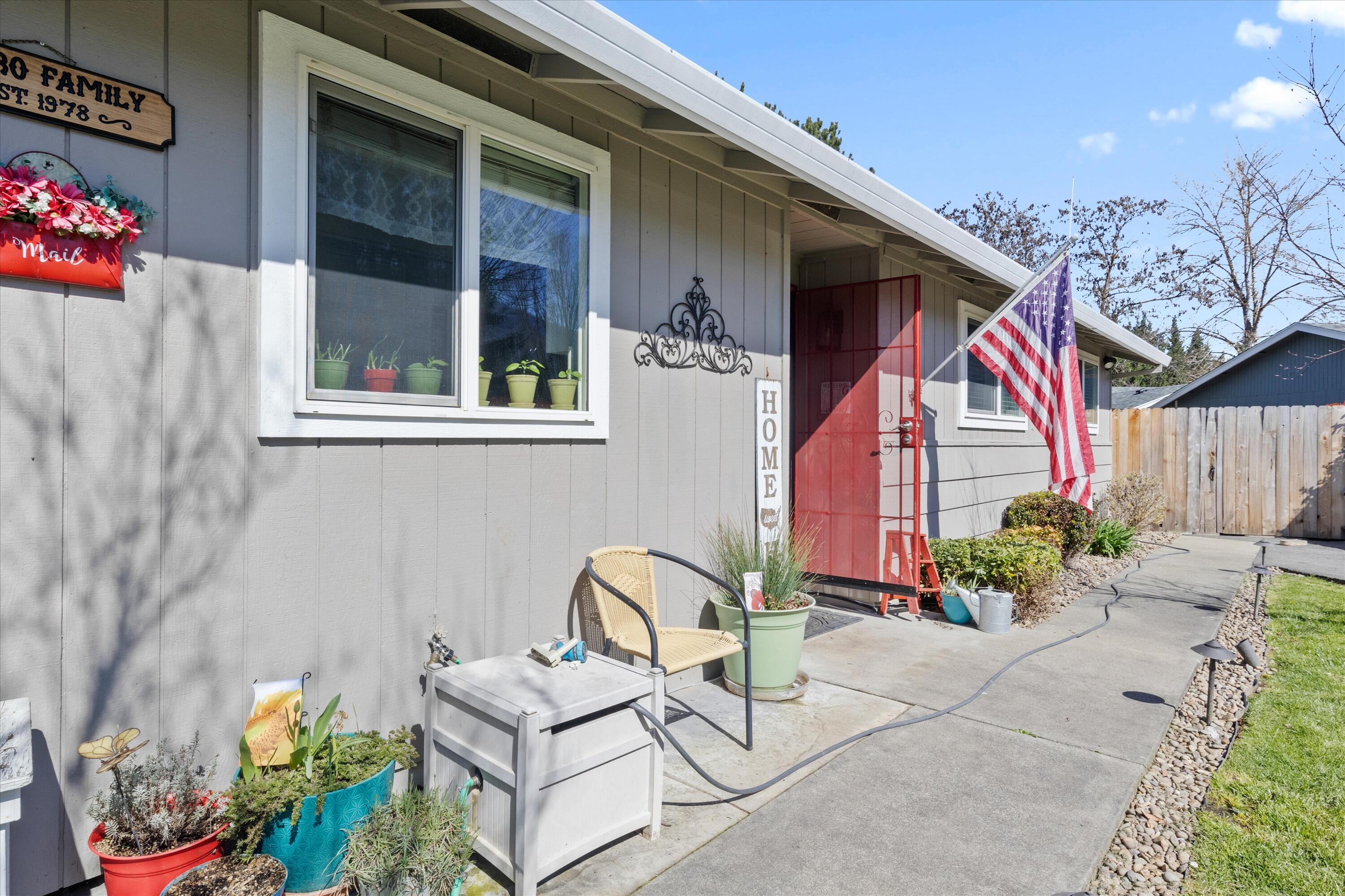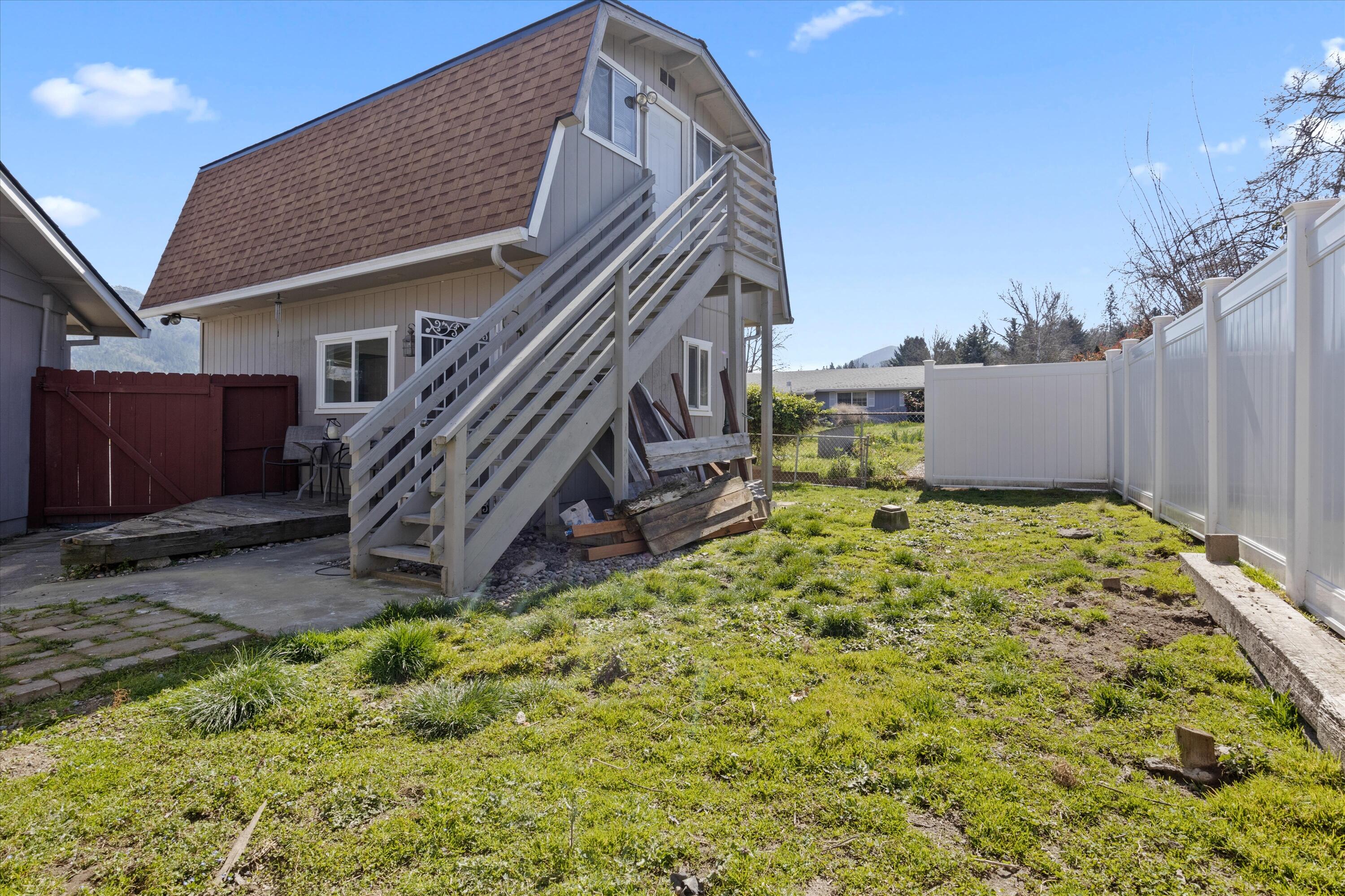 Tremendously Captivating Home with a new roof and Solar Panels, full RV hook-ups, and Detached ADU! Marvelously situated on a 0.35-acre cul-de-sac lot in an established community, this 3BR/2BA property warmly welcomes with a classic exterior color scheme, brilliant red front door, and a neatly manicured fenced-in front yard. Filled with soft natural light, the interior delights with luminous skylights, an open floorplan, vaulted ceilings, beautiful faux wood flooring, and a living room with a wood burning stove. Upgraded to perfection, the kitchen features stainless steel appliances, two-tone cabinets, gas stove, and a dining area. Intended for relaxation, the primary bedroom includes an attached en suite with a dual sink vanity. Multigenerational appeal is found in the detached ADU, which has a 3/4-bathroom and a full kitchen. Other features: 2-car garage with workshop/ storage. The newly fenced-in back yard features paver patio under a gazebo, numerous fruit trees, and chicken coop!