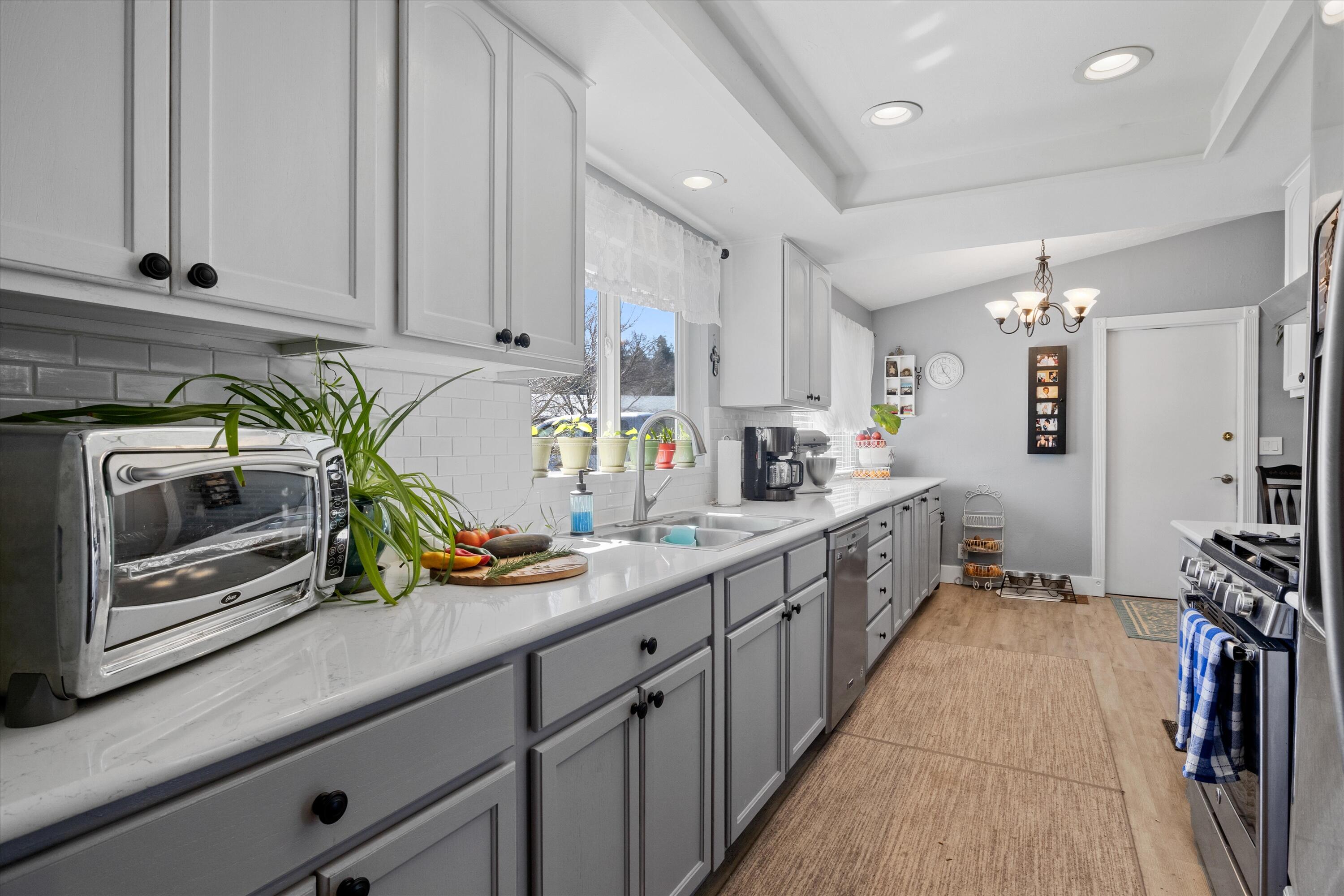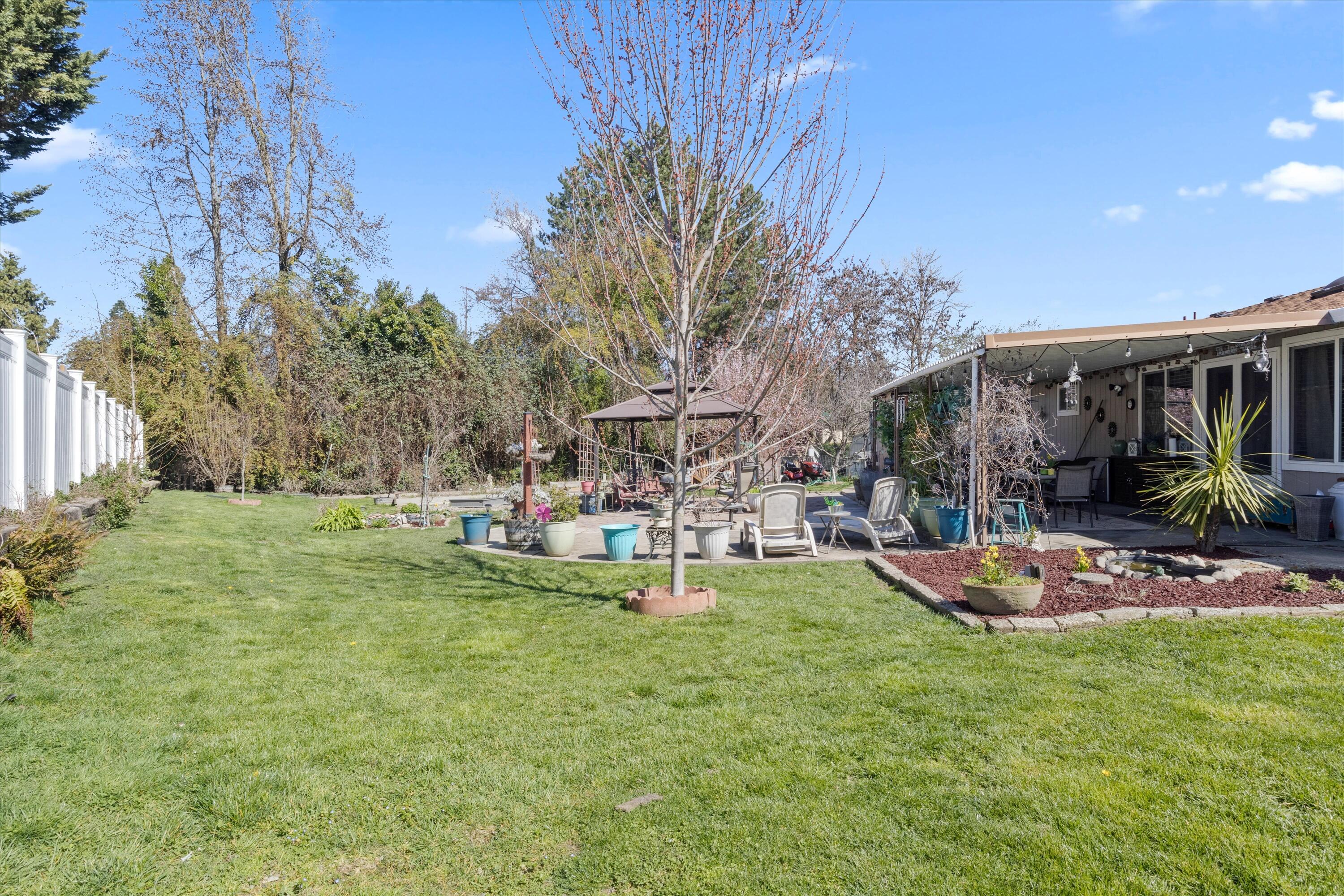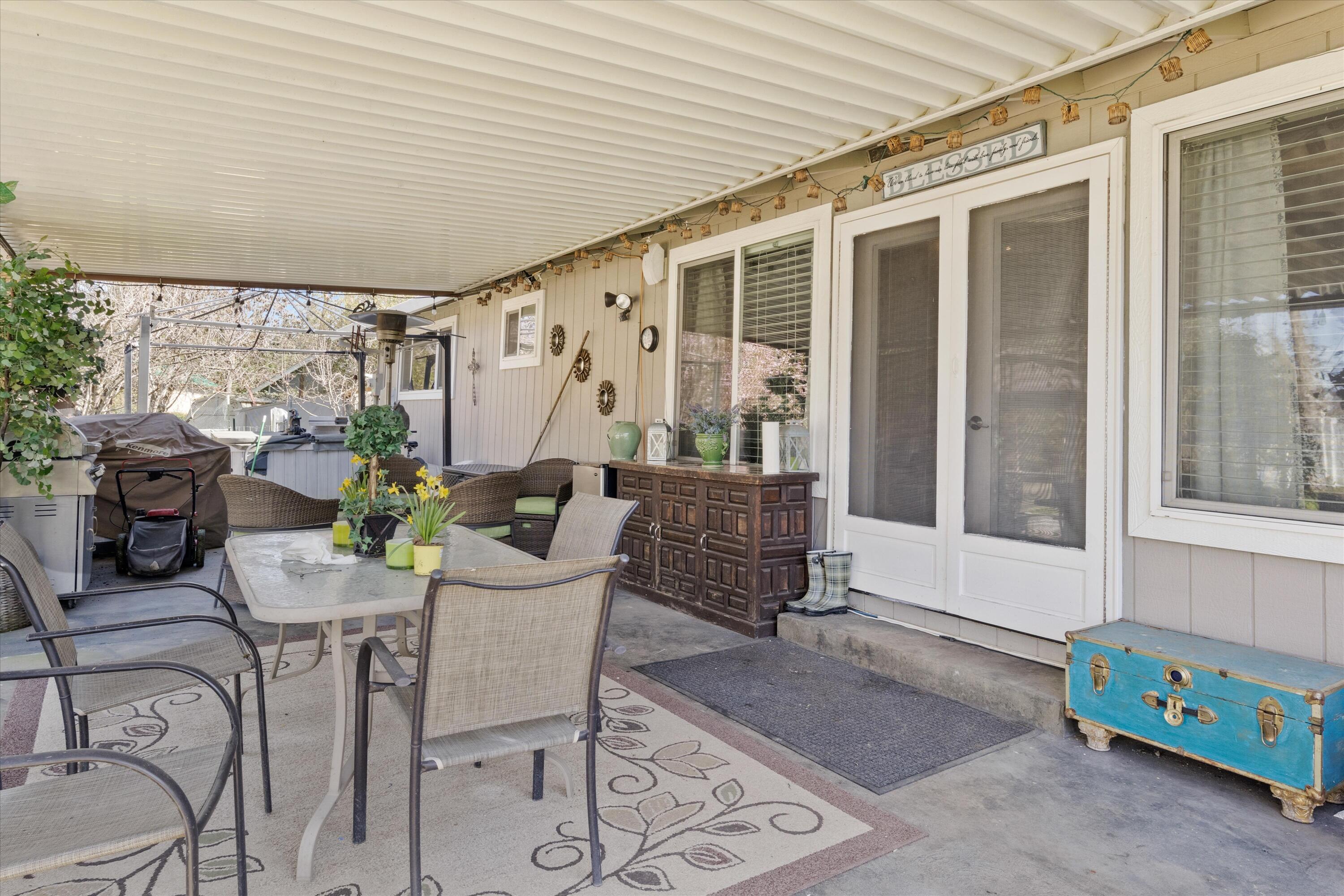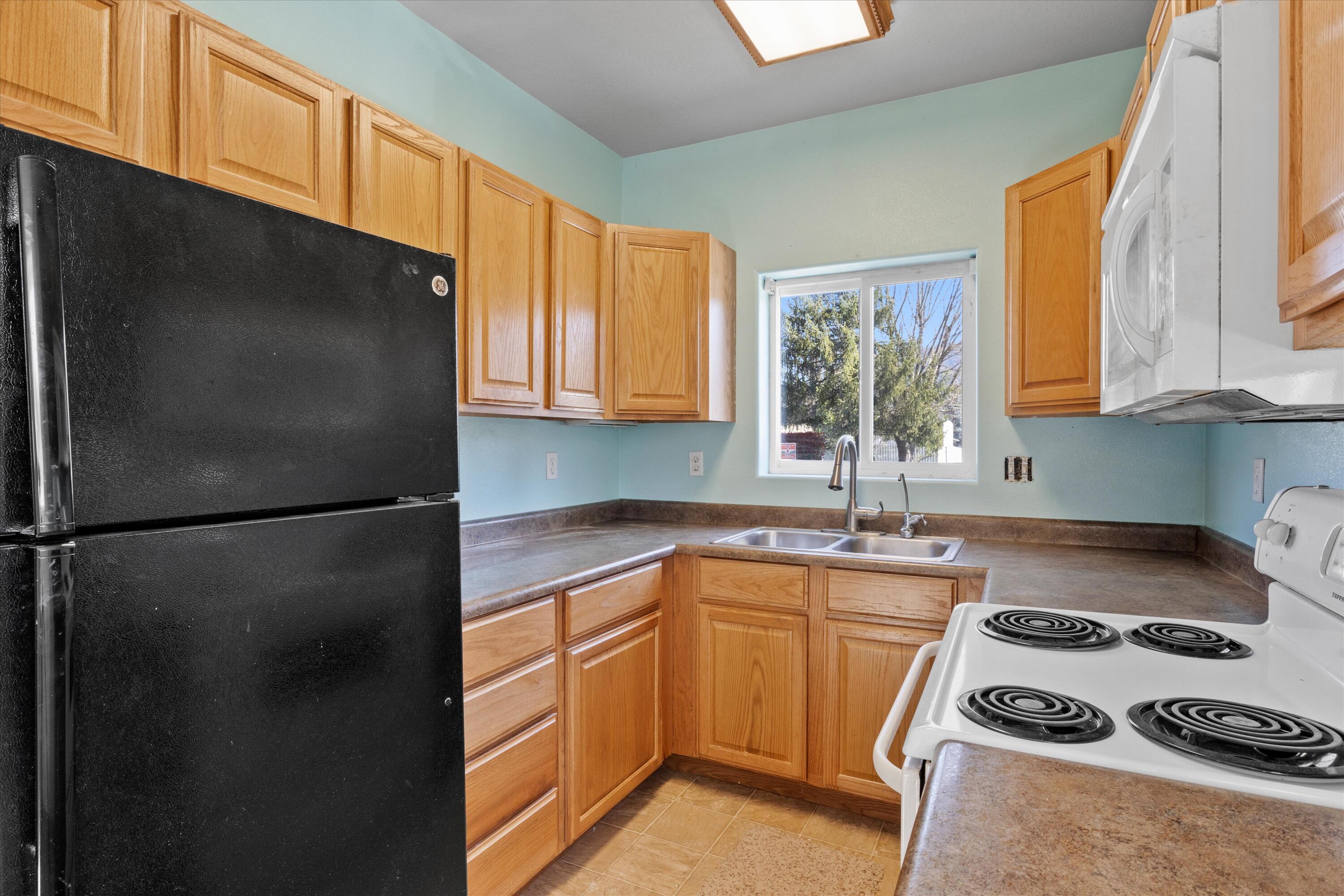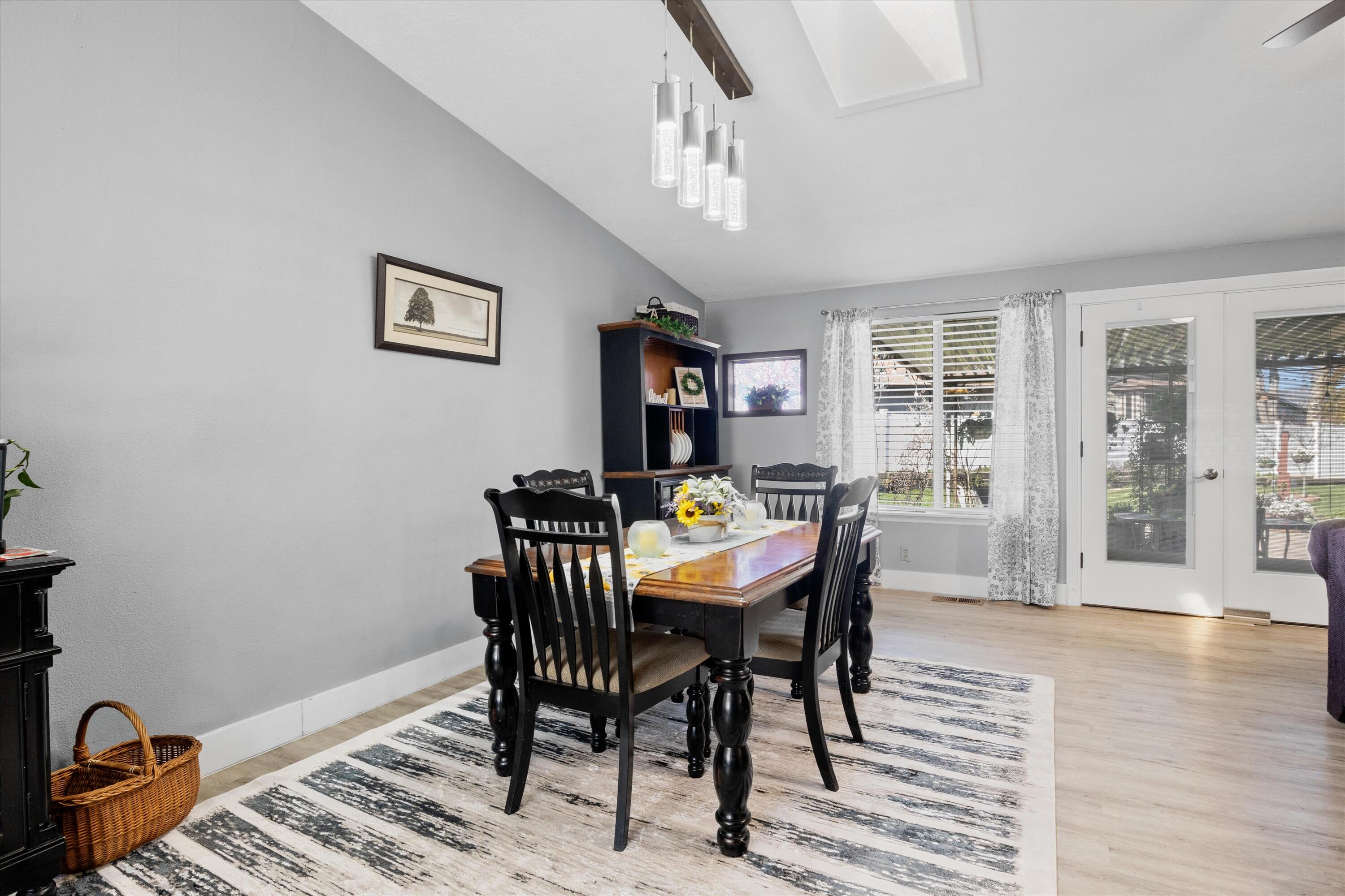 Tremendously Captivating Home with a new roof and Solar Panels, full RV hook-ups, and Detached ADU! Marvelously situated on a 0.35-acre cul-de-sac lot in an established community, this 3BR/2BA property warmly welcomes with a classic exterior color scheme, brilliant red front door, and a neatly manicured fenced-in front yard. Filled with soft natural light, the interior delights with luminous skylights, an open floorplan, vaulted ceilings, beautiful faux wood flooring, and a living room with a wood burning stove. Upgraded to perfection, the kitchen features stainless steel appliances, two-tone cabinets, gas stove, and a dining area. Intended for relaxation, the primary bedroom includes an attached en suite with a dual sink vanity. Multigenerational appeal is found in the detached ADU, which has a 3/4-bathroom and a full kitchen. Other features: 2-car garage with workshop/ storage. The newly fenced-in back yard features paver patio under a gazebo, numerous fruit trees, and chicken coop!