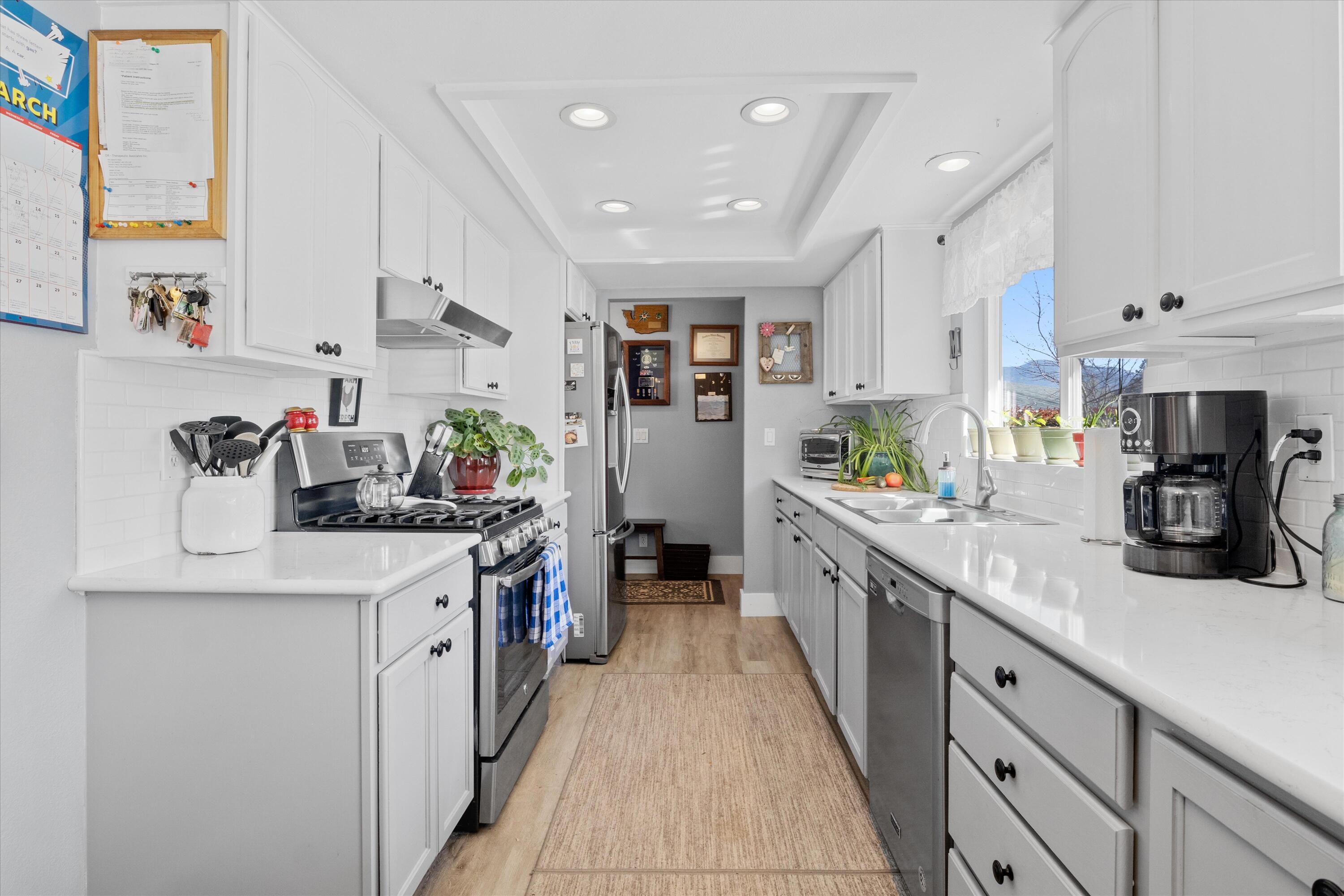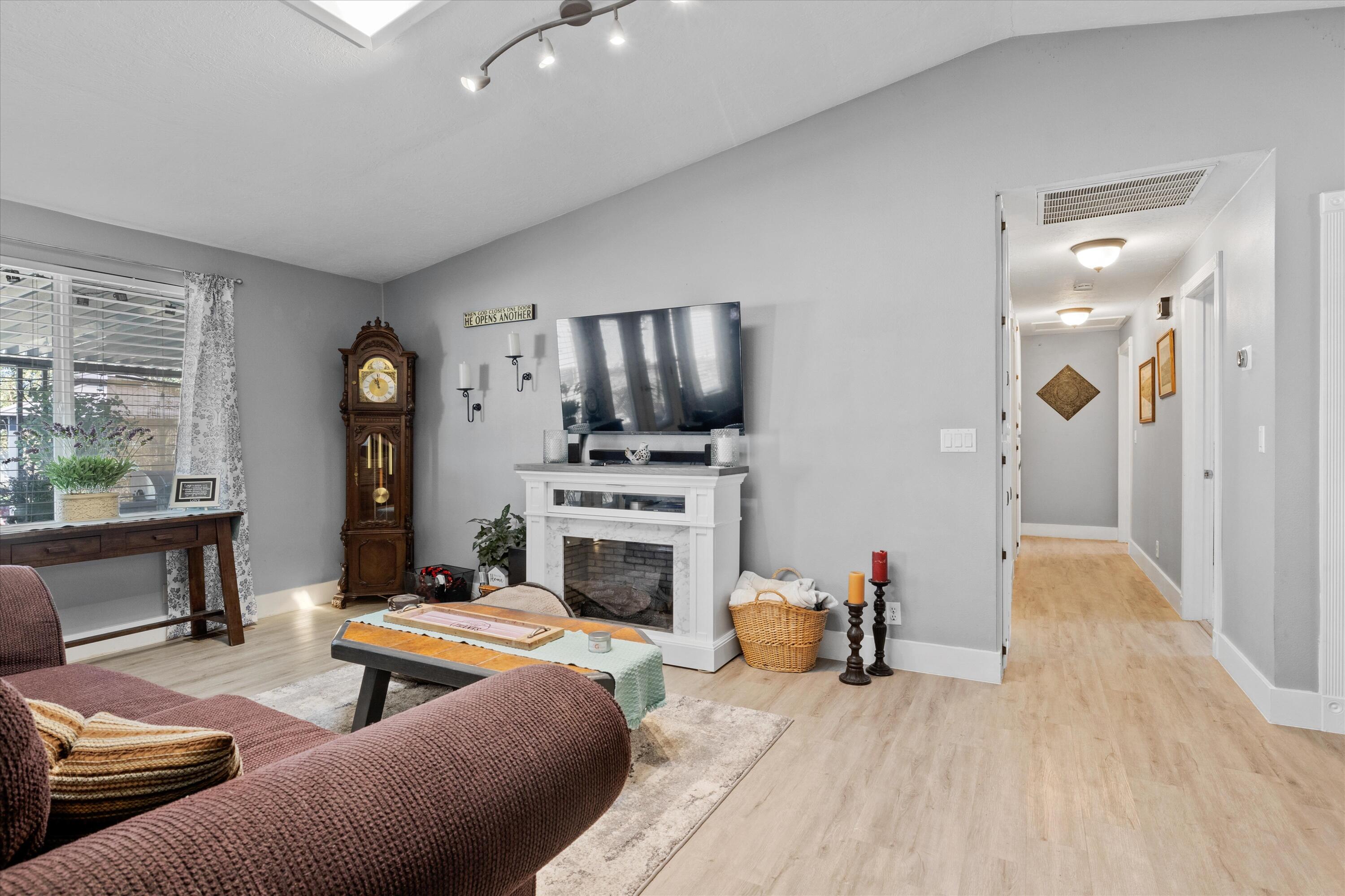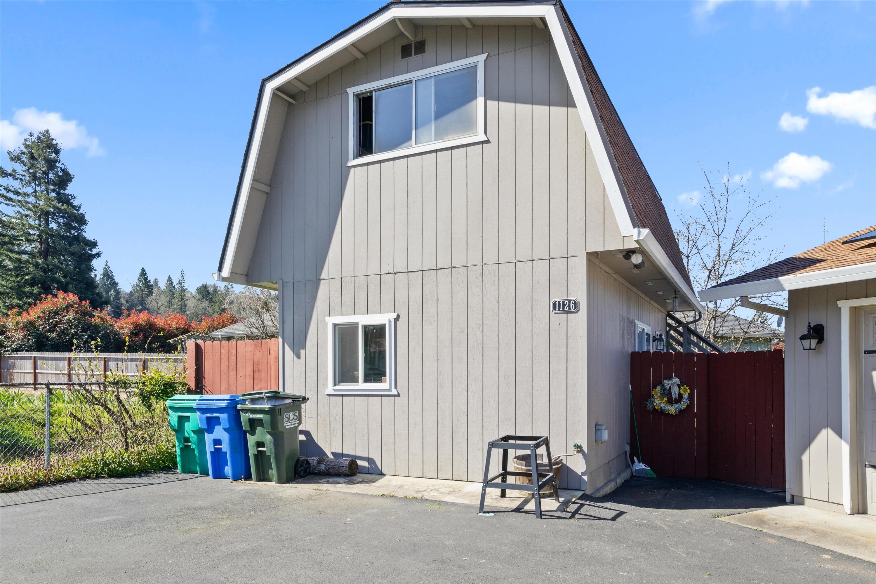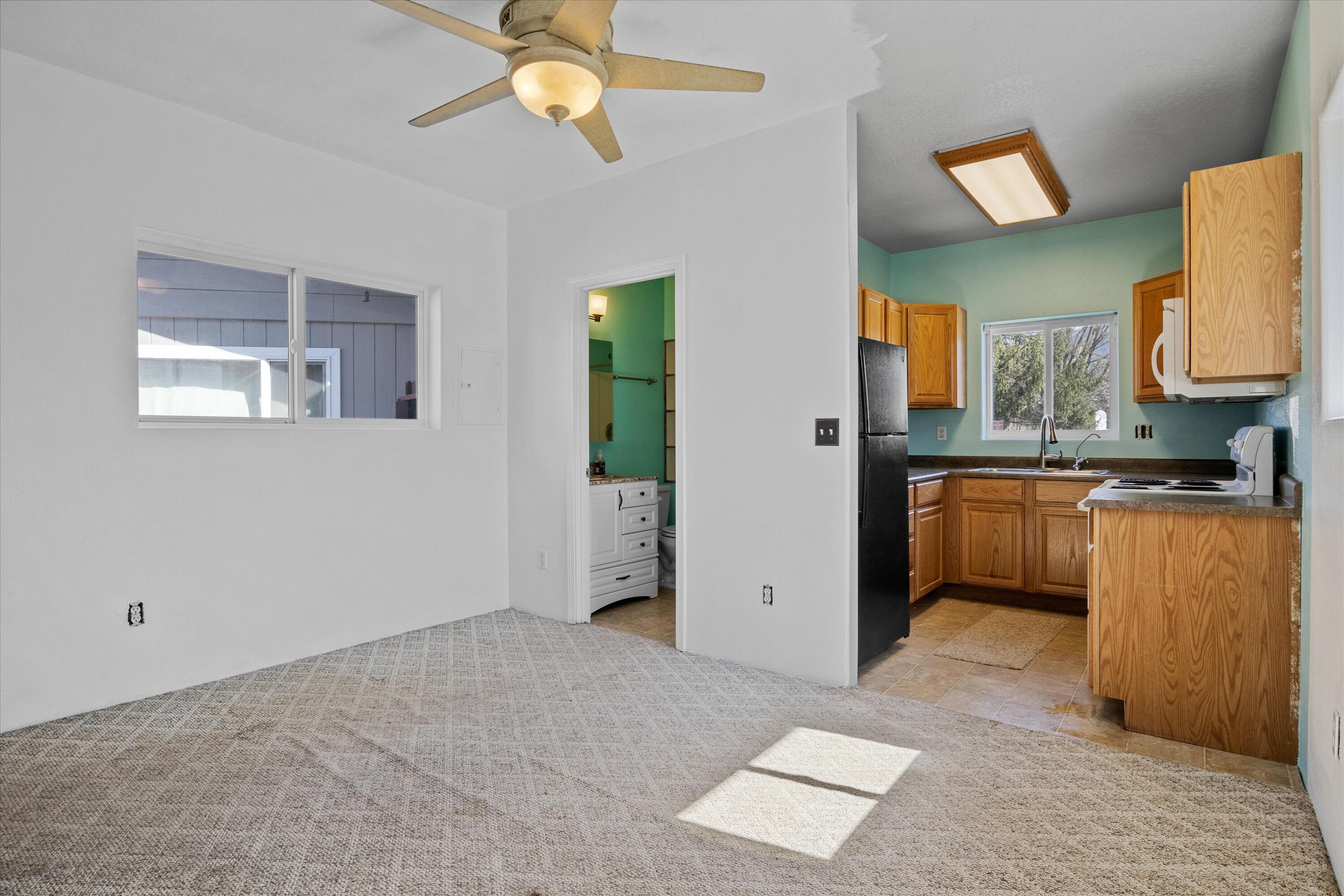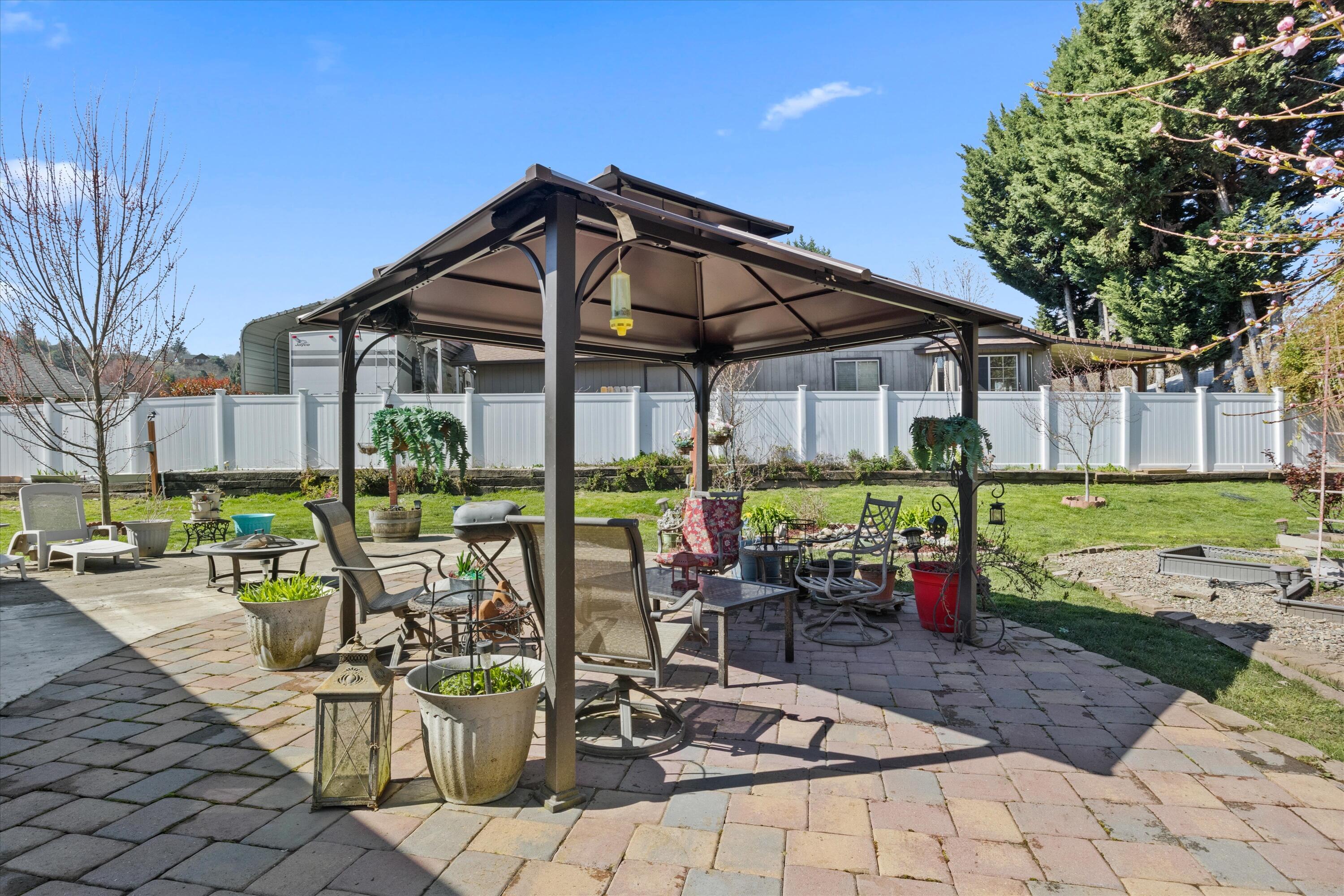 Tremendously Captivating Home with a new roof and Solar Panels, full RV hook-ups, and Detached ADU! Marvelously situated on a 0.35-acre cul-de-sac lot in an established community, this 3BR/2BA property warmly welcomes with a classic exterior color scheme, brilliant red front door, and a neatly manicured fenced-in front yard. Filled with soft natural light, the interior delights with luminous skylights, an open floorplan, vaulted ceilings, beautiful faux wood flooring, and a living room with a wood burning stove. Upgraded to perfection, the kitchen features stainless steel appliances, two-tone cabinets, gas stove, and a dining area. Intended for relaxation, the primary bedroom includes an attached en suite with a dual sink vanity. Multigenerational appeal is found in the detached ADU, which has a 3/4-bathroom and a full kitchen. Other features: 2-car garage with workshop/ storage. The newly fenced-in back yard features paver patio under a gazebo, numerous fruit trees, and chicken coop!