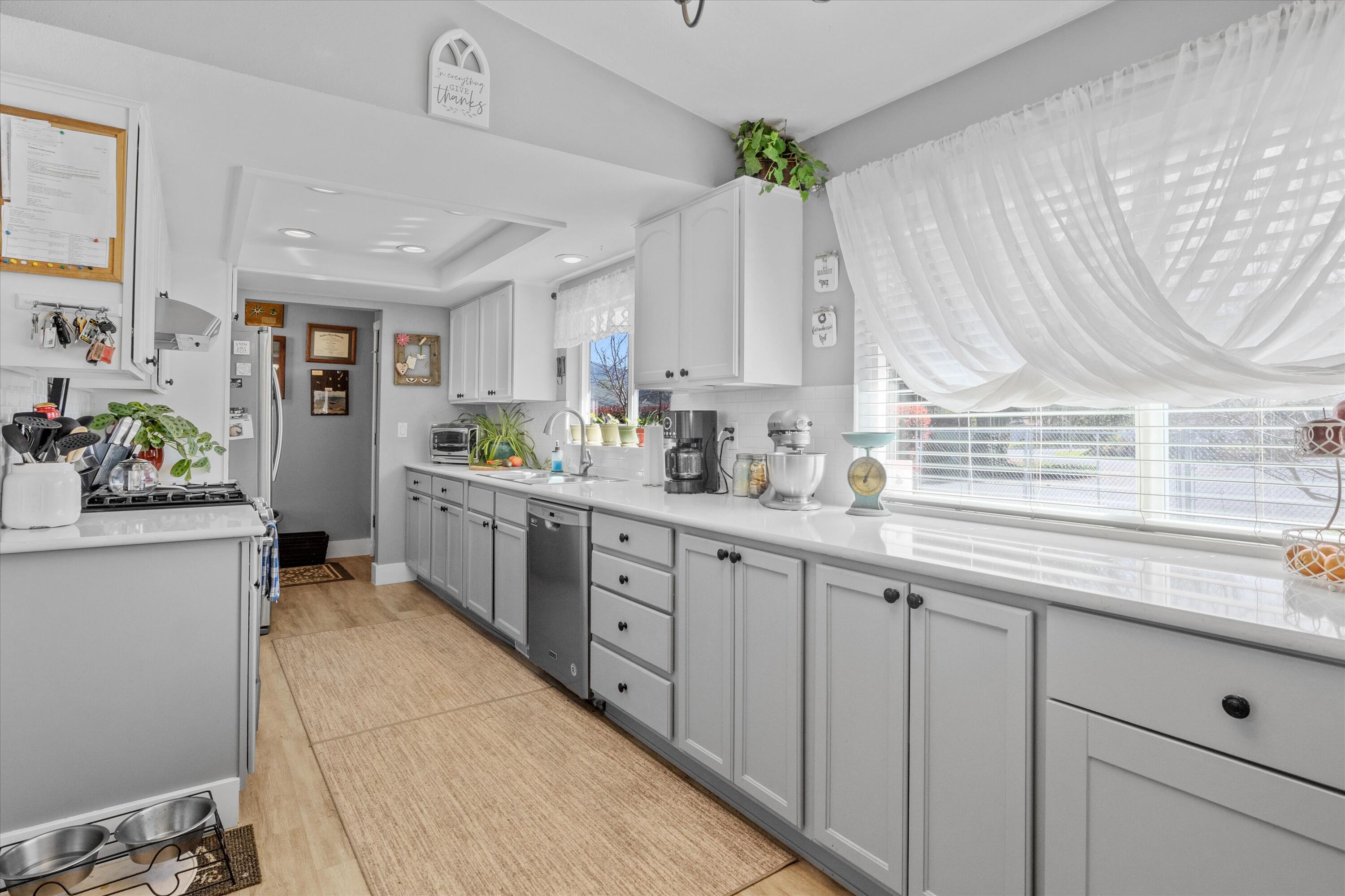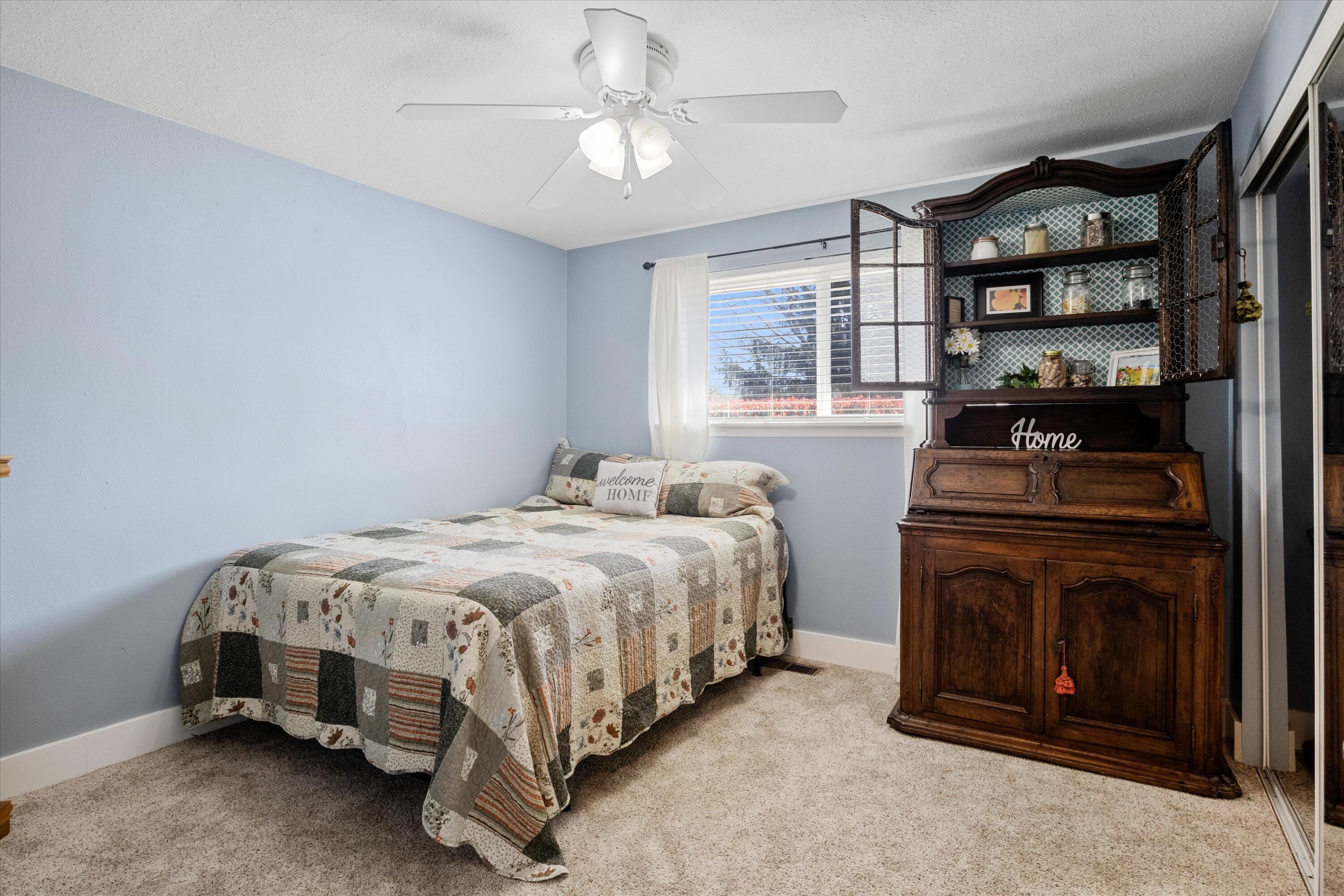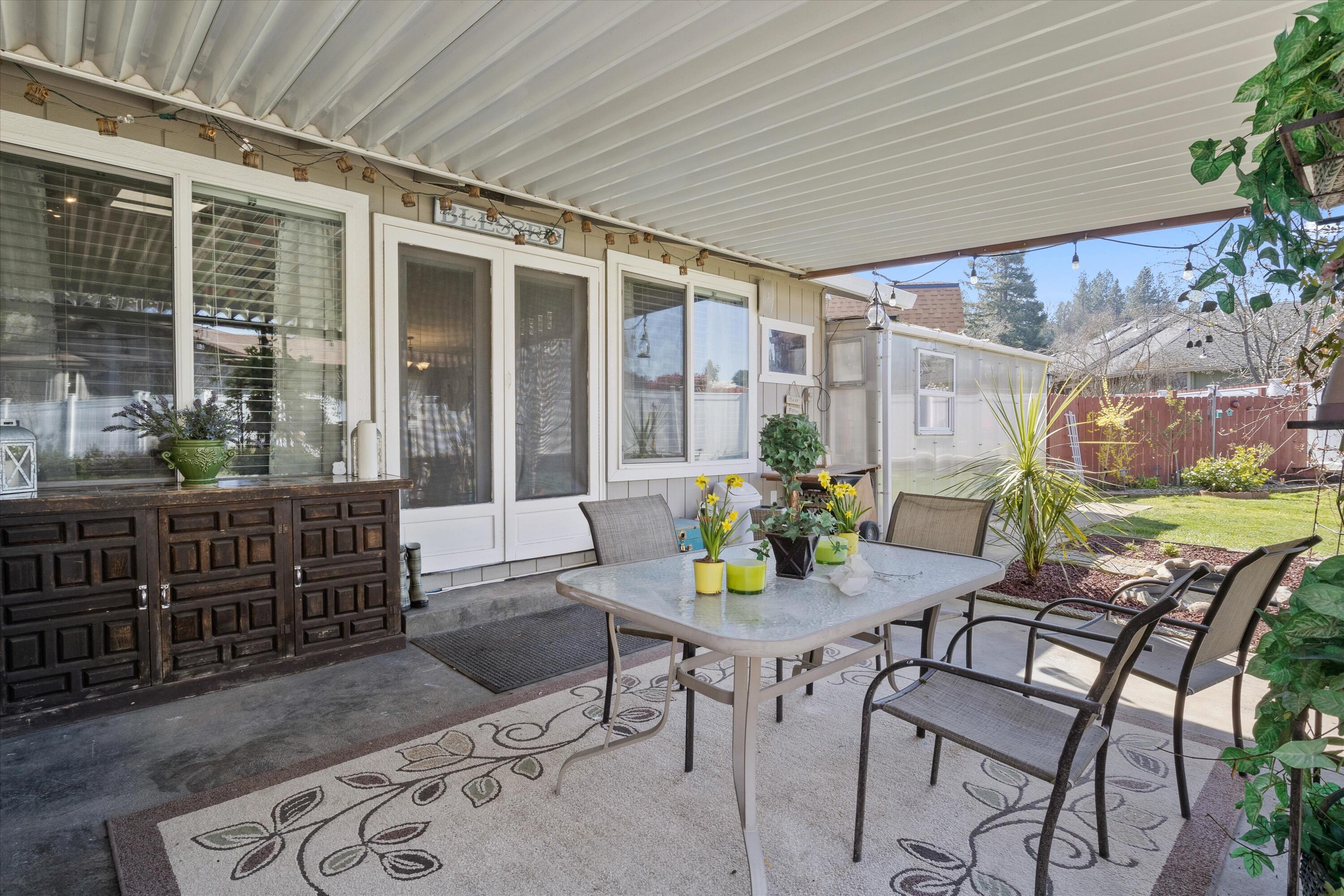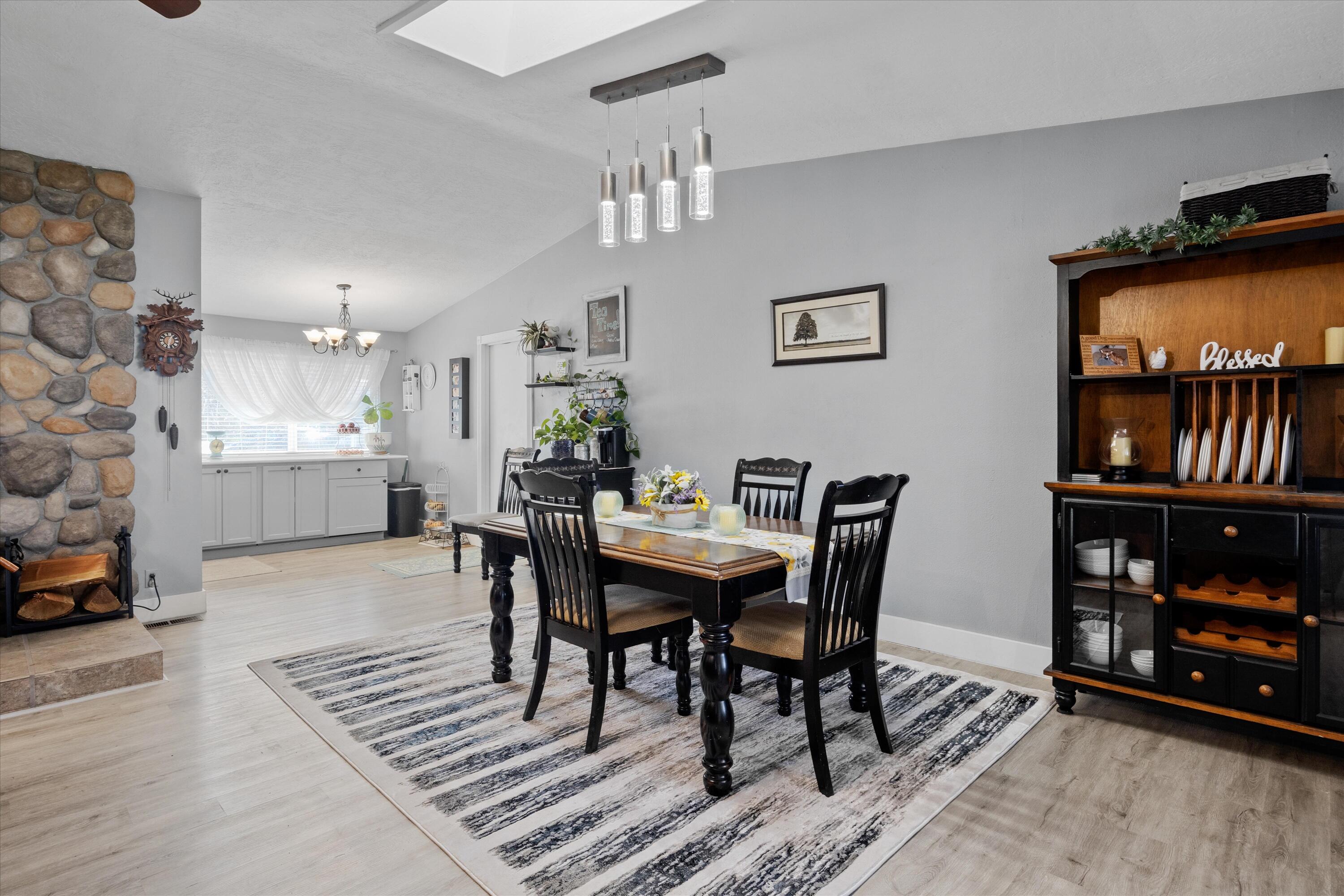 Tremendously Captivating Home with a new roof and Solar Panels, full RV hook-ups, and Detached ADU! Marvelously situated on a 0.35-acre cul-de-sac lot in an established community, this 3BR/2BA property warmly welcomes with a classic exterior color scheme, brilliant red front door, and a neatly manicured fenced-in front yard. Filled with soft natural light, the interior delights with luminous skylights, an open floorplan, vaulted ceilings, beautiful faux wood flooring, and a living room with a wood burning stove. Upgraded to perfection, the kitchen features stainless steel appliances, two-tone cabinets, gas stove, and a dining area. Intended for relaxation, the primary bedroom includes an attached en suite with a dual sink vanity. Multigenerational appeal is found in the detached ADU, which has a 3/4-bathroom and a full kitchen. Other features: 2-car garage with workshop/ storage. The newly fenced-in back yard features paver patio under a gazebo, numerous fruit trees, and chicken coop!