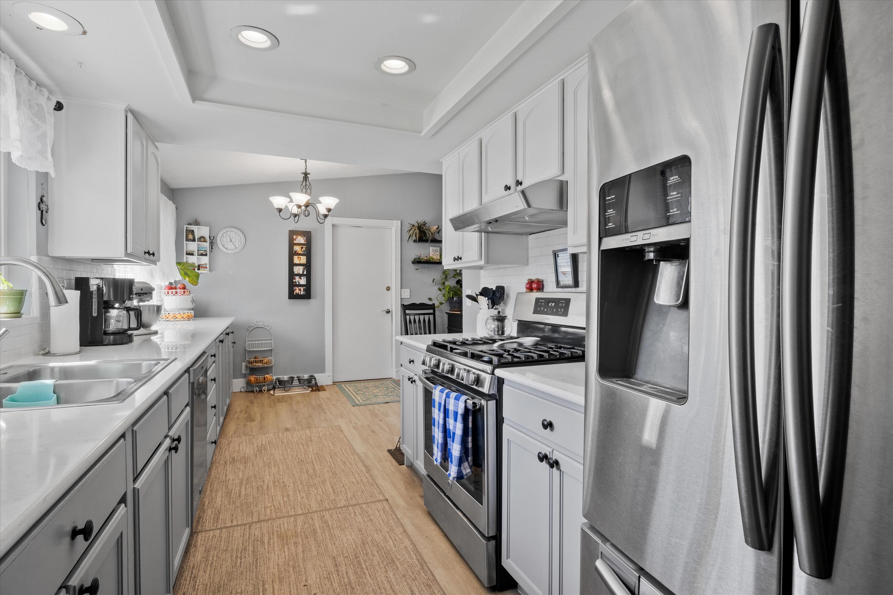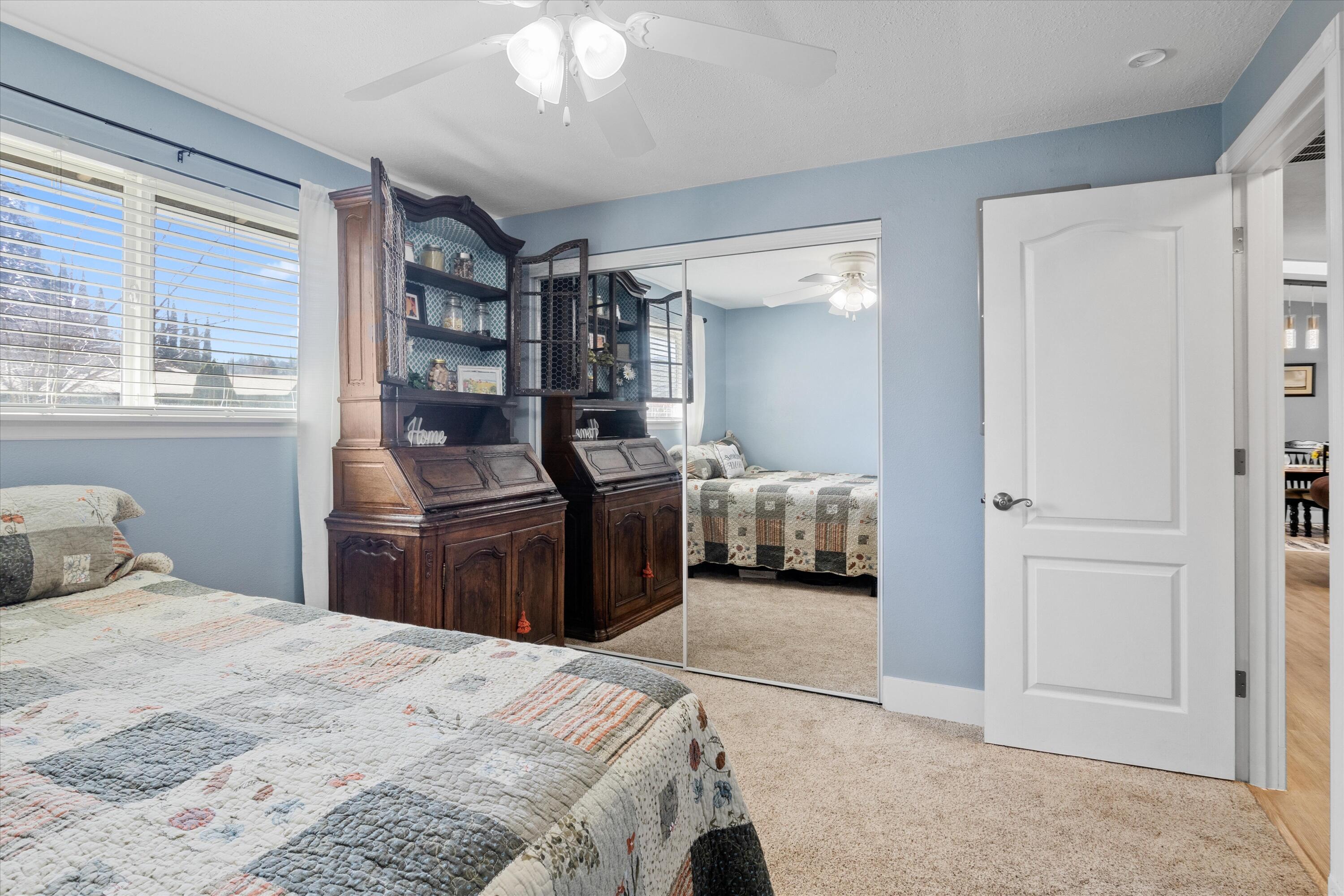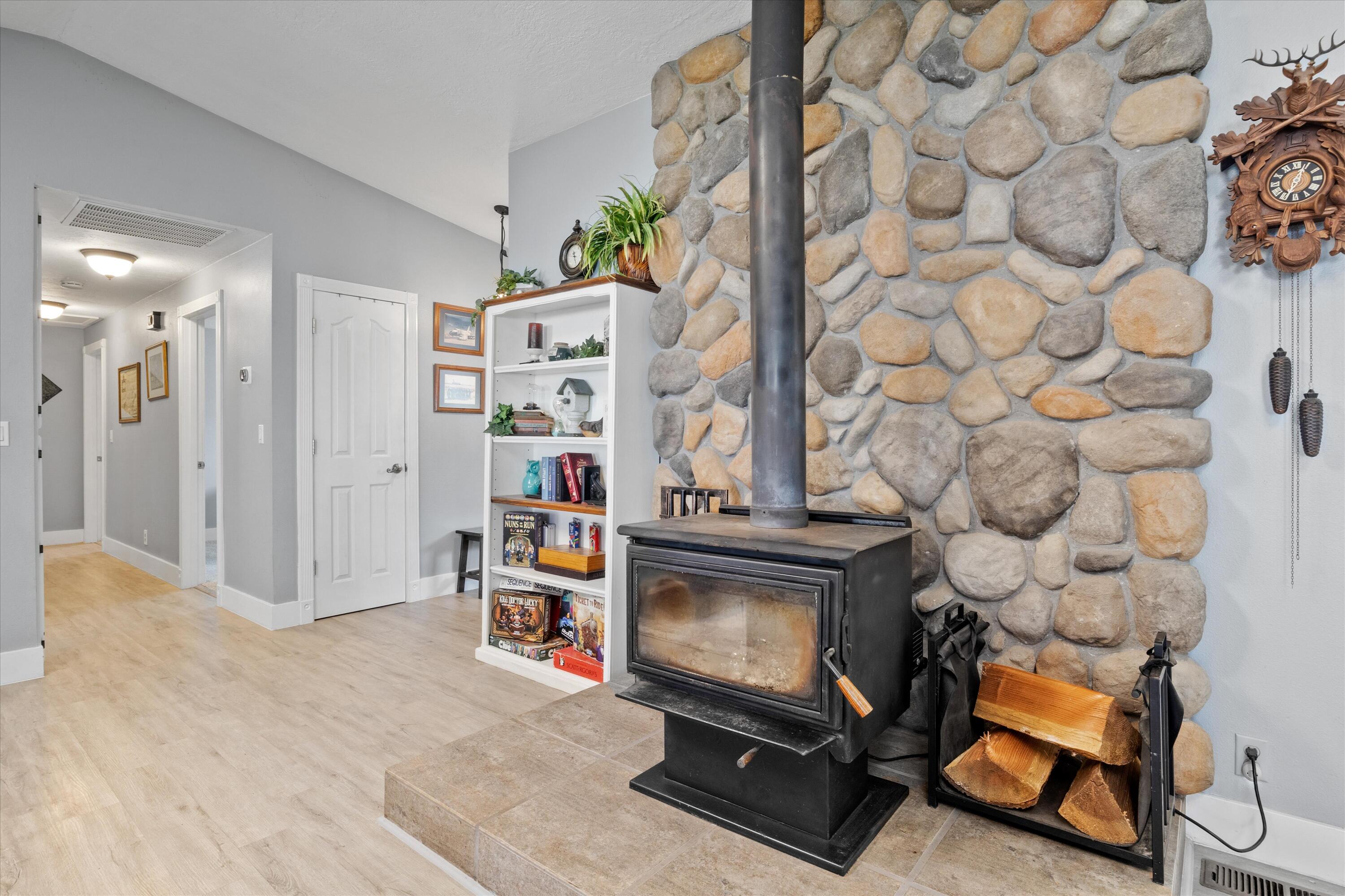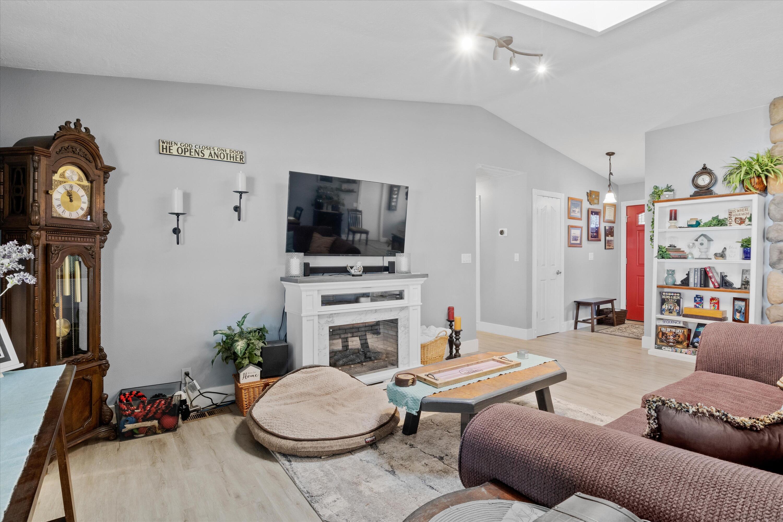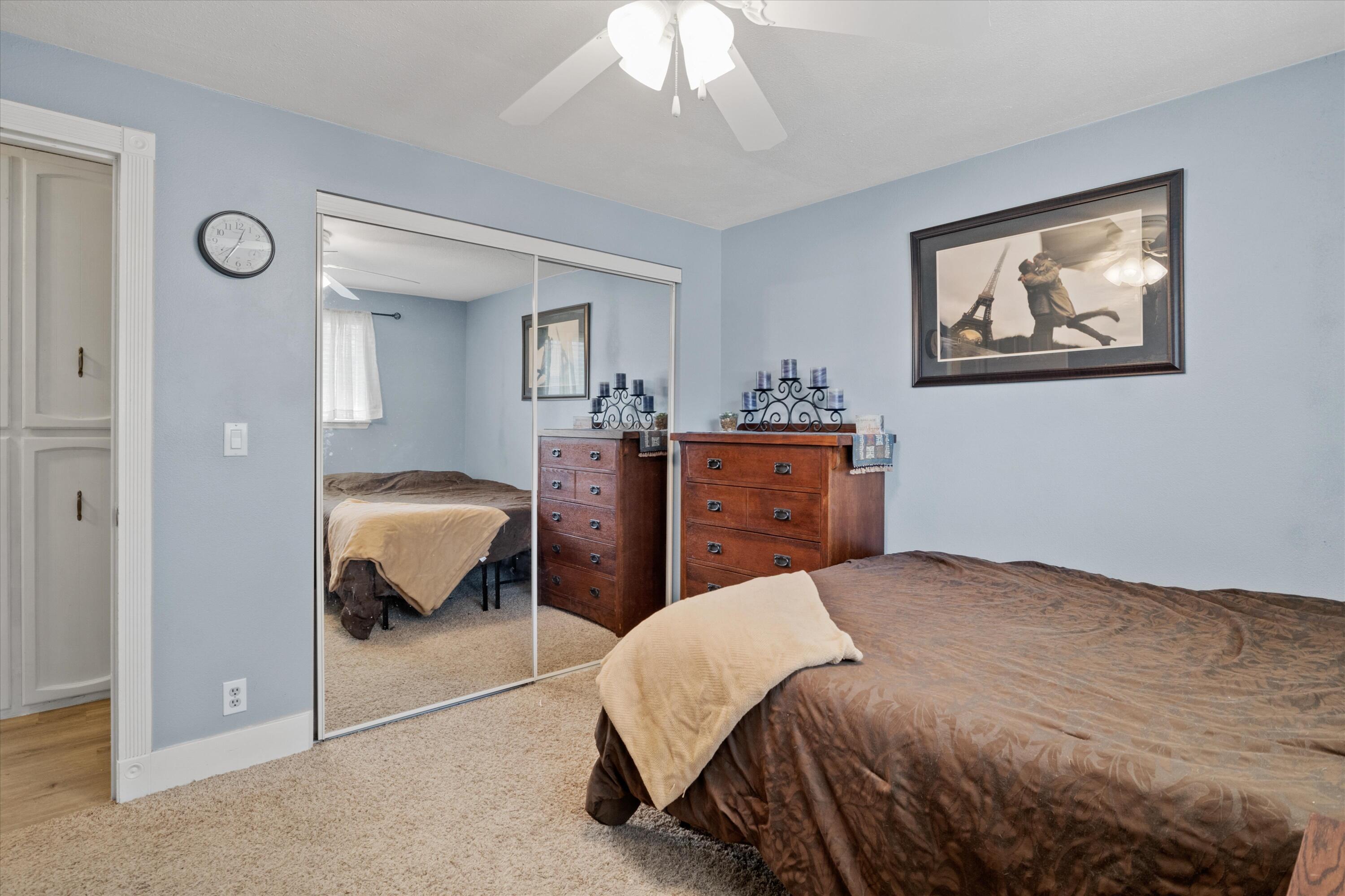 Tremendously Captivating Home with a new roof and Solar Panels, full RV hook-ups, and Detached ADU! Marvelously situated on a 0.35-acre cul-de-sac lot in an established community, this 3BR/2BA property warmly welcomes with a classic exterior color scheme, brilliant red front door, and a neatly manicured fenced-in front yard. Filled with soft natural light, the interior delights with luminous skylights, an open floorplan, vaulted ceilings, beautiful faux wood flooring, and a living room with a wood burning stove. Upgraded to perfection, the kitchen features stainless steel appliances, two-tone cabinets, gas stove, and a dining area. Intended for relaxation, the primary bedroom includes an attached en suite with a dual sink vanity. Multigenerational appeal is found in the detached ADU, which has a 3/4-bathroom and a full kitchen. Other features: 2-car garage with workshop/ storage. The newly fenced-in back yard features paver patio under a gazebo, numerous fruit trees, and chicken coop!