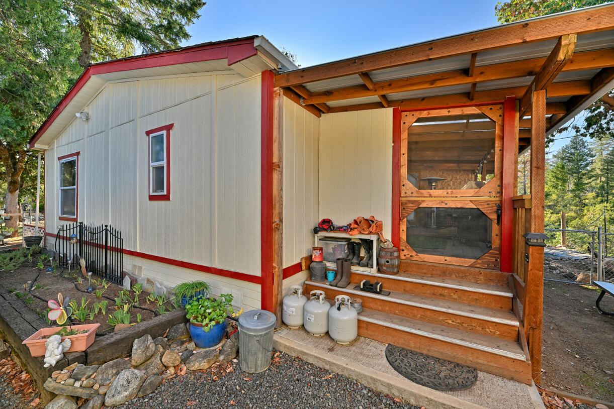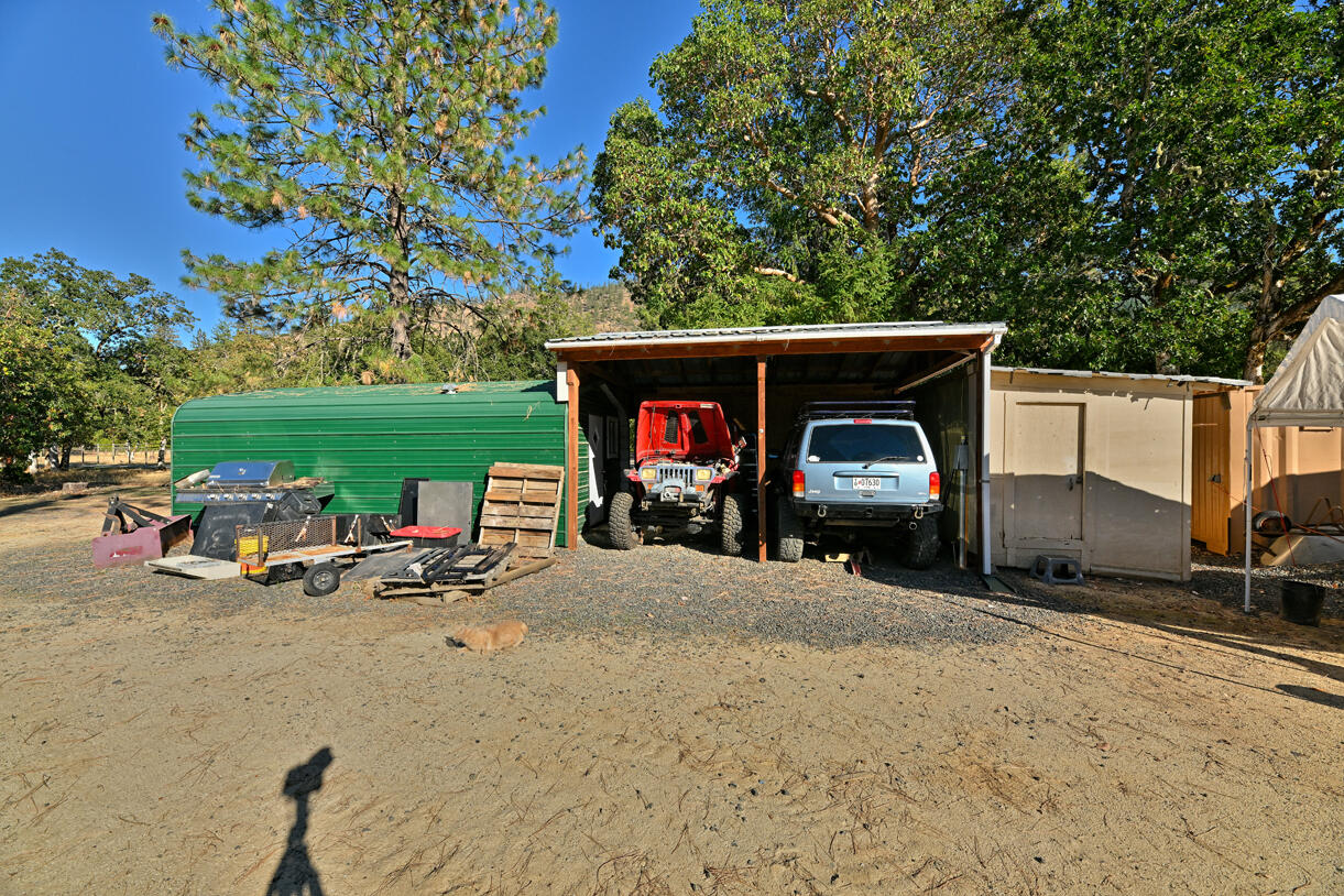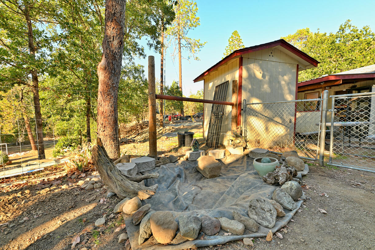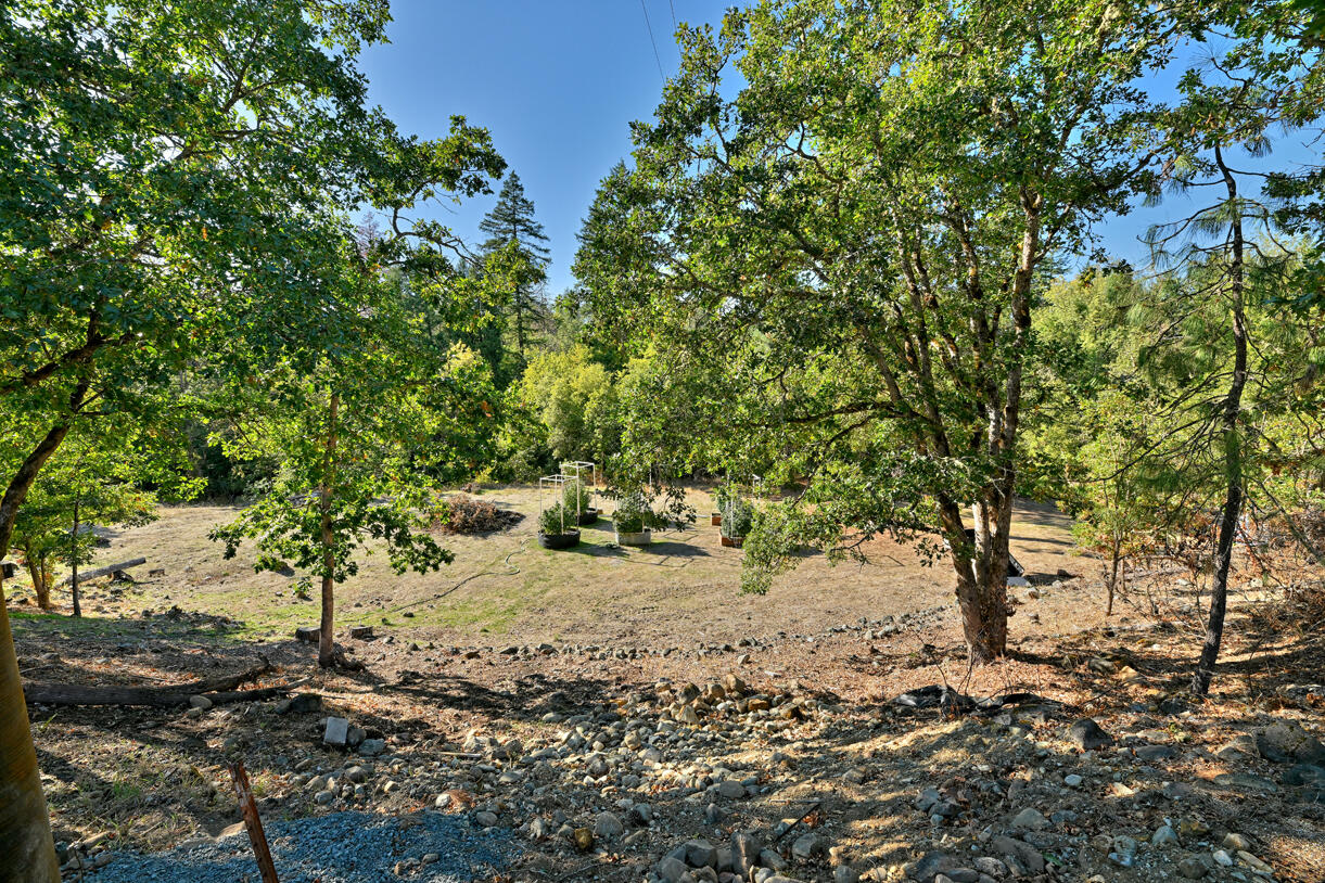 Peaceful country living on five serene acres with Jump Off Joe Creek meandering through the lower portion of the property. The home features vaulted ceilings, abundant natural light, and beautifully updated bedrooms and bathrooms that balance rustic charm with modern comfort. Enjoy a drip-irrigated garden space, greenhouse, and established apple and plum trees. The property includes a 24' x 24' heated detached garage, 12' x 21' Quonset hut, 16' x 12' shed, 8' x 6' pump house with hand pump and storage, plus a shipping container for additional utility. Plenty of room for RV parking, tools, and equipment--offering endless versatility for hobbies or projects. Tools and equipment will be removed by close of escrow. Please only approach property with a scheduled appointment.